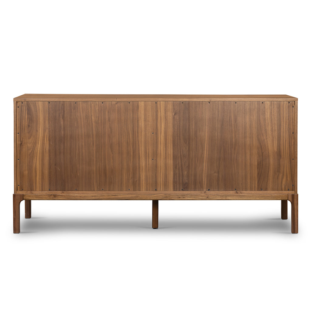 Inspired by campaign-style furniture of the 1800s — packable pieces first designed for traveling military use — a simply shaped dresser of natural walnut features a subtly inset top and rounded legs, finished with wooden hardware.