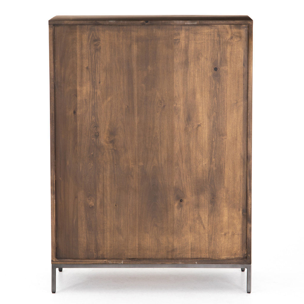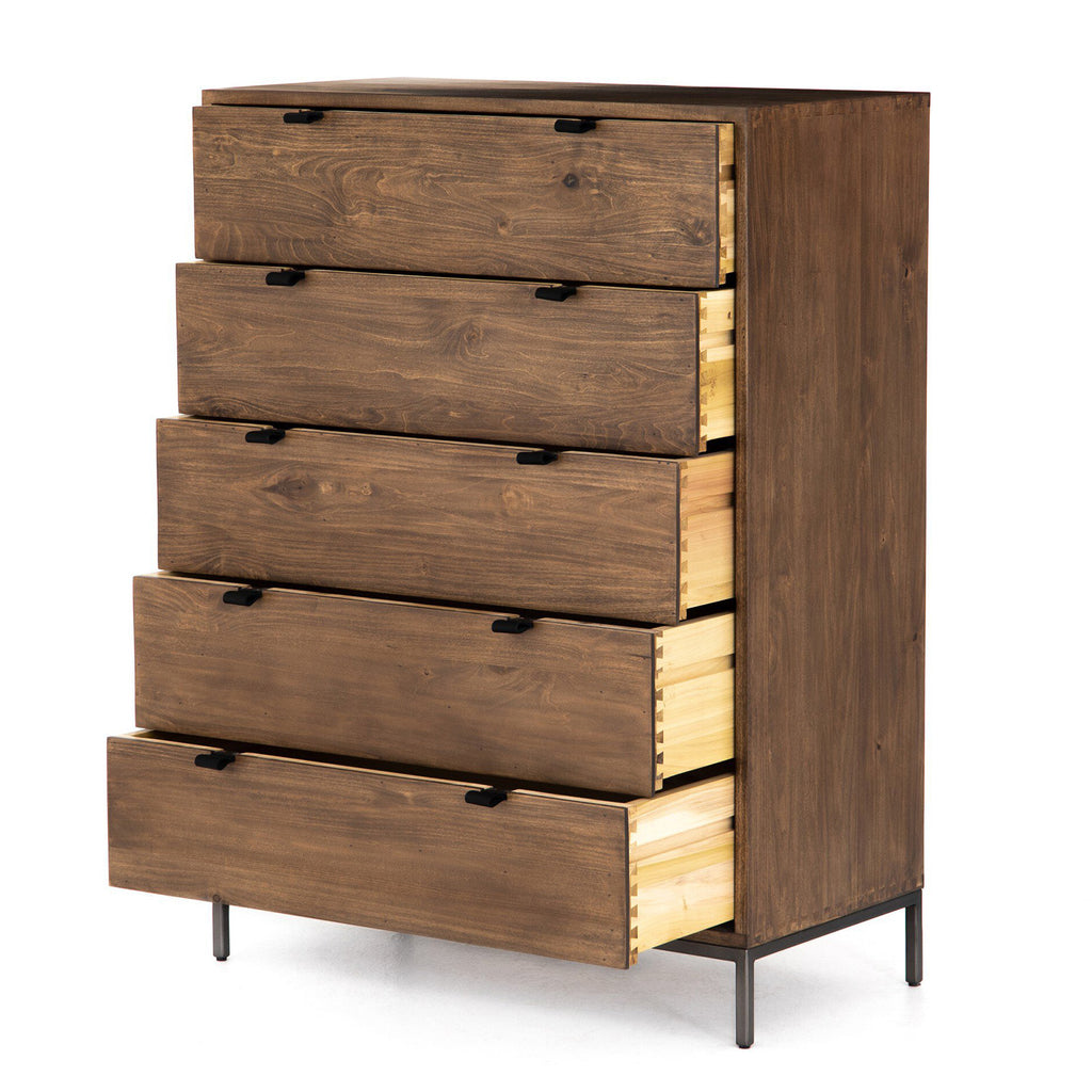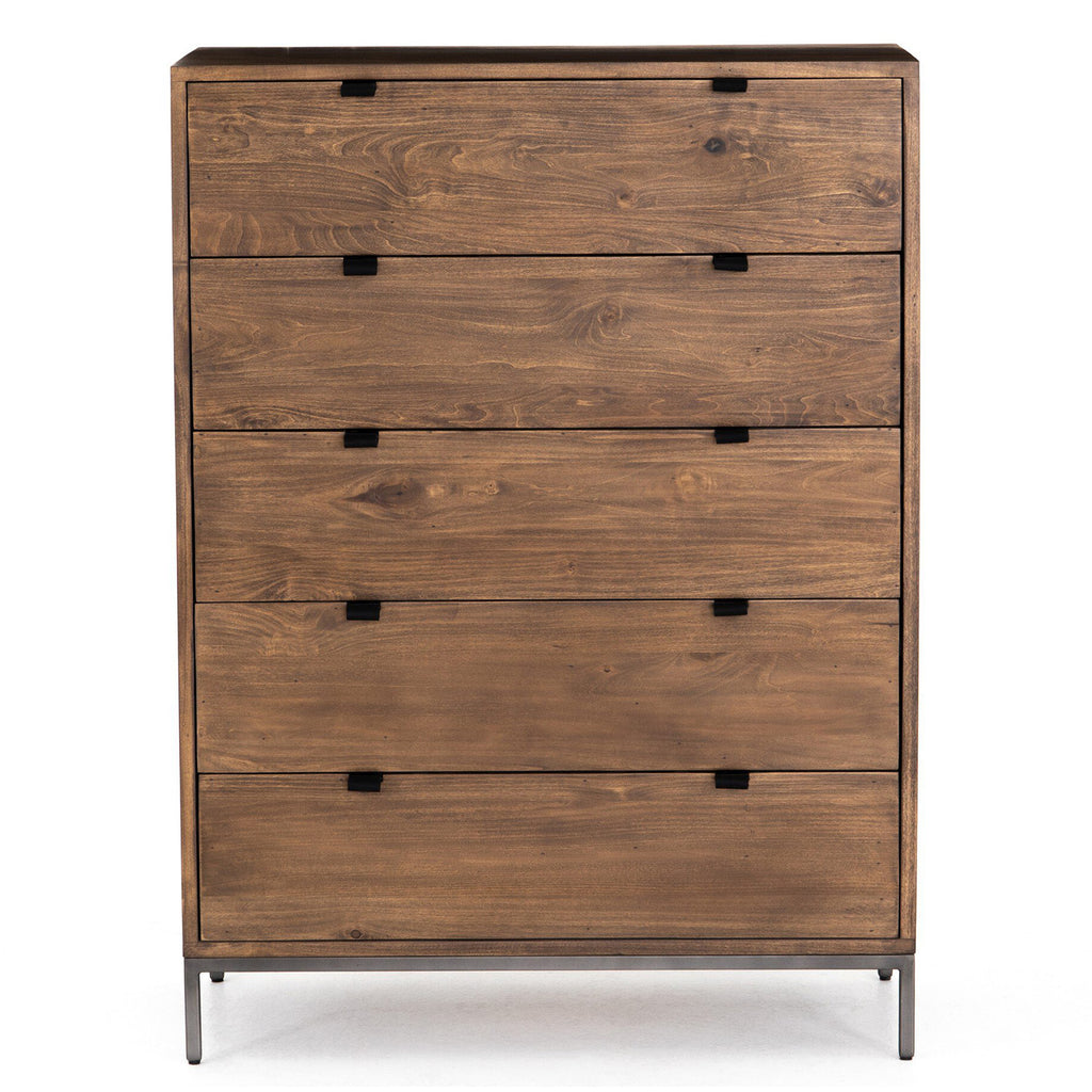 Inspired by clean mid-century design, a stylish dresser offers plenty of bedroom storage space thanks to five spacious drawers. Metal-secured leather pulls add a textural element of surprise.