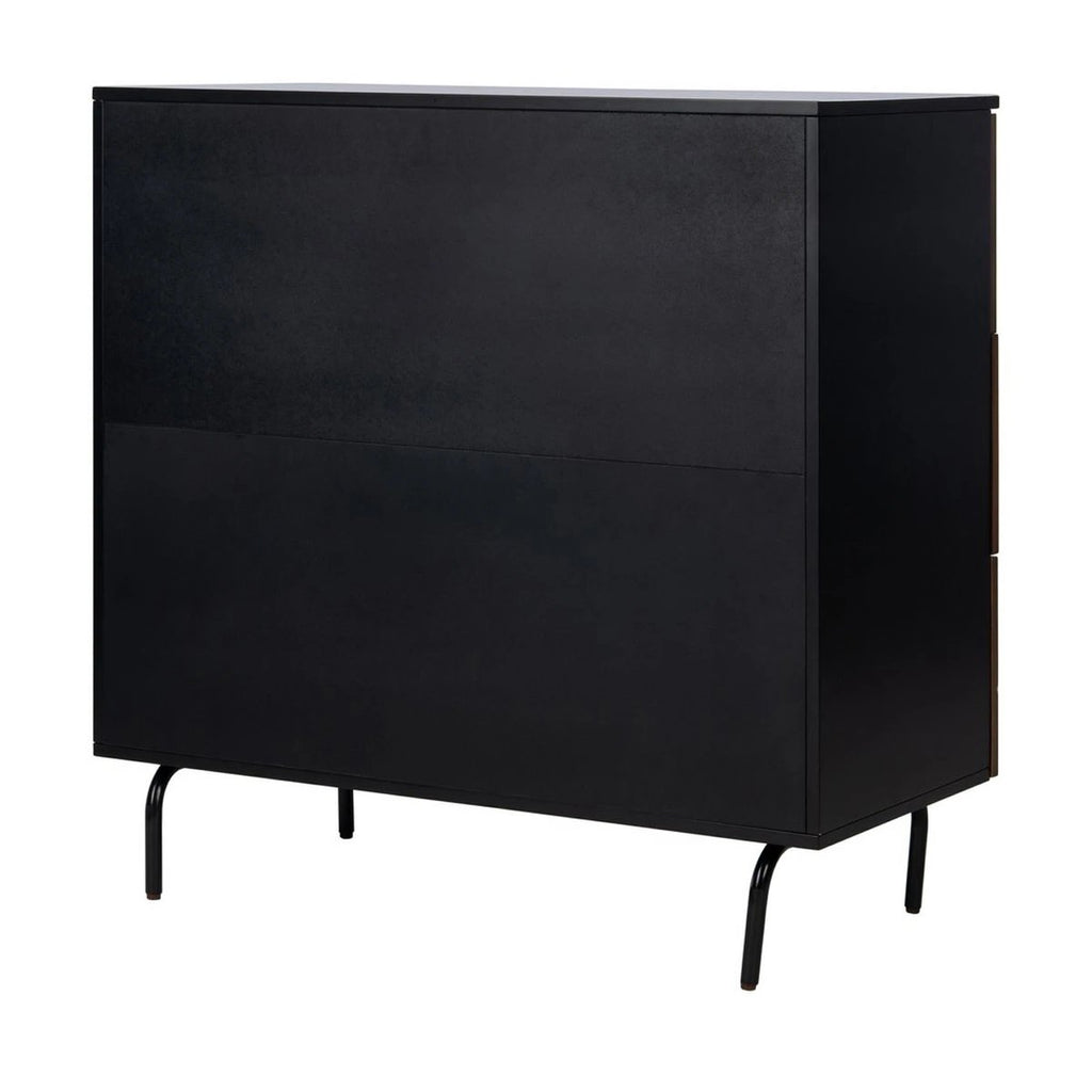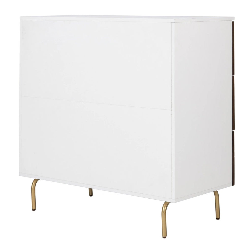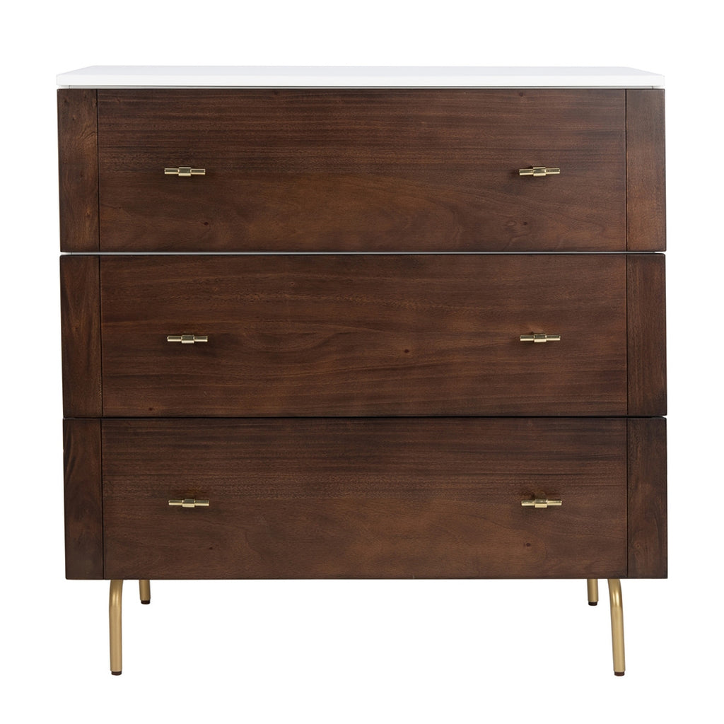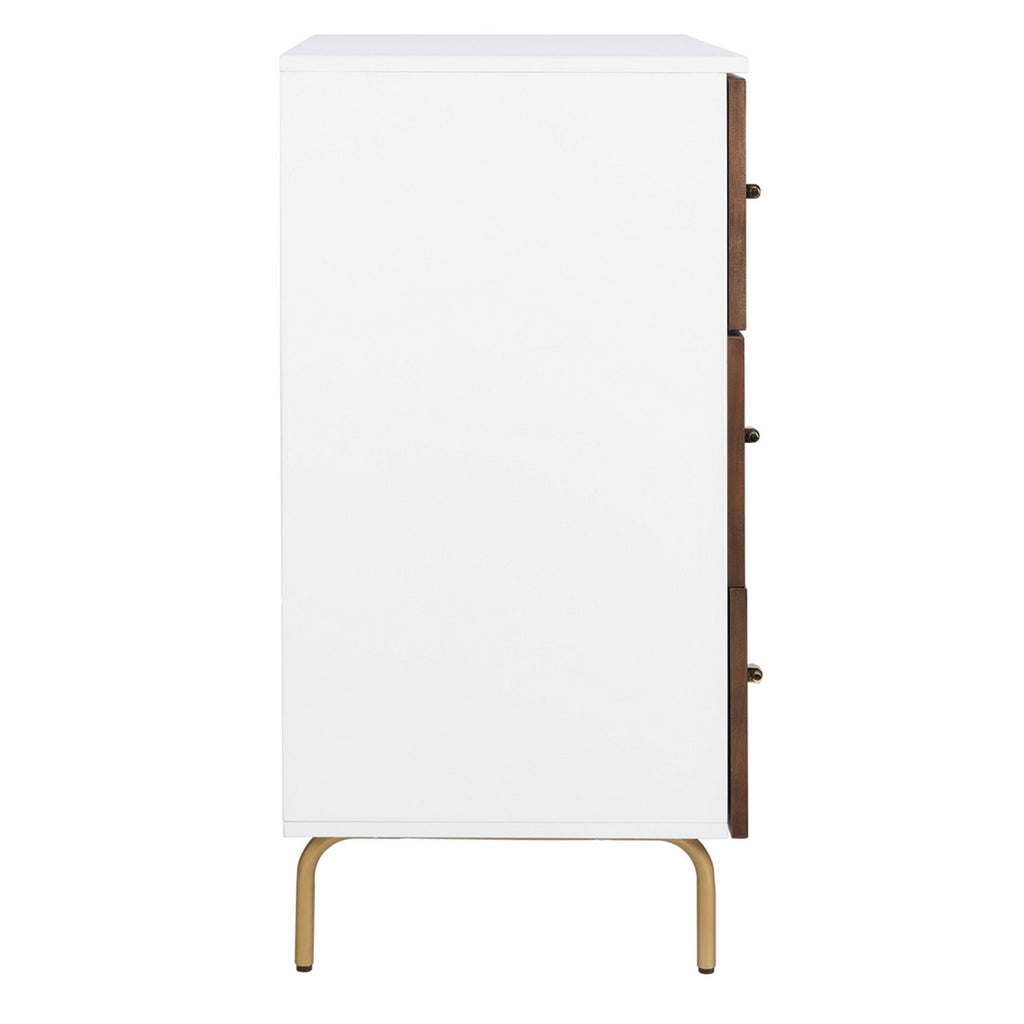 A chic addition to any bedroom, this bright 3-drawer dresser is an investment. A contemporary update on a beloved retro design, its sleek Walnut with Black and Black legs or Walnut & White with Gold legs highlights its clean, minimalist lines and modern hardware. Gold pulls over three generous drawers enhances its transitional allure.