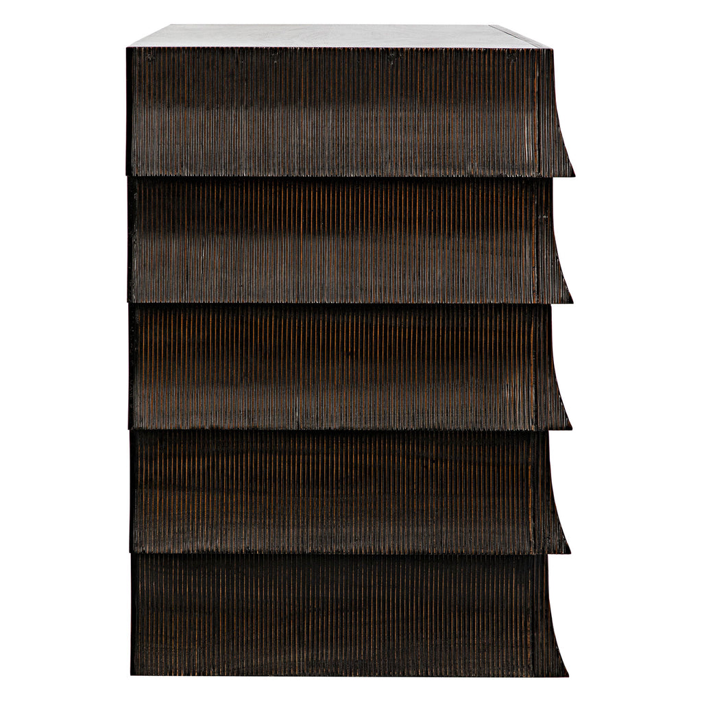 Store your everyday items in style with this contemporary dresser from Noir. Functional yet full of elegant detail, this furnishing updates any room with a bold statement. Ruffled carvings inspired by the dresses worn by flappers in the 1930's elevate the 5-drawer Noir Ava dresser far above the ordinary. Hand carved of mahogany; it is finished in a hand rubbed black with light brown highlights.