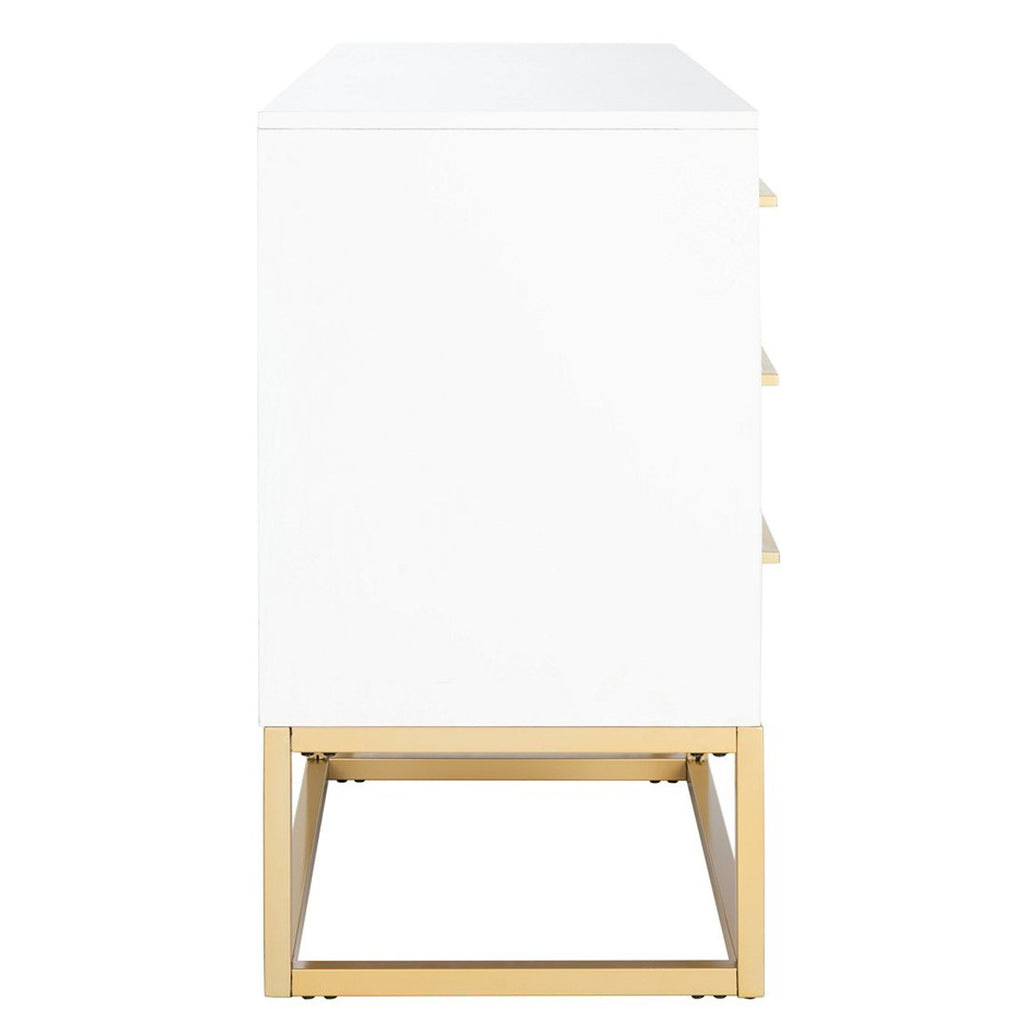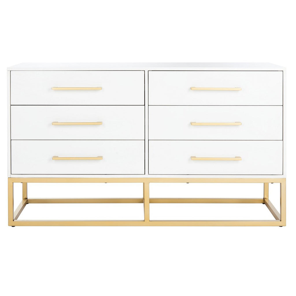Alive with natural beauty and a dynamic modern pattern, this contemporary dresser brings élan to any bedroom. Designed with a White, Walnut or Teal finish and substantial brass metal hardware and legs, its generous six drawers make it as functional as it is stylish.