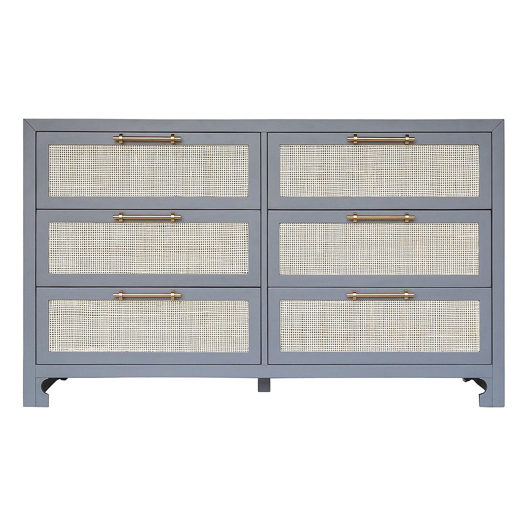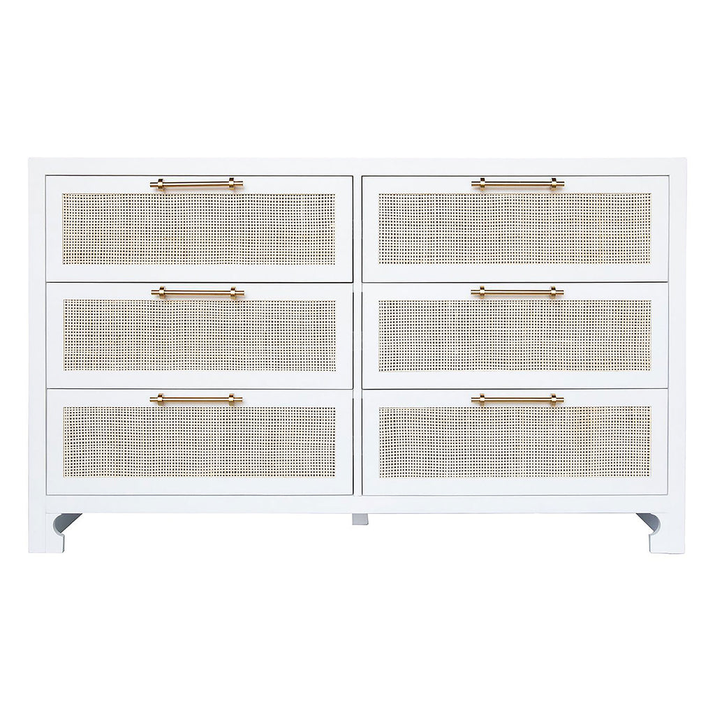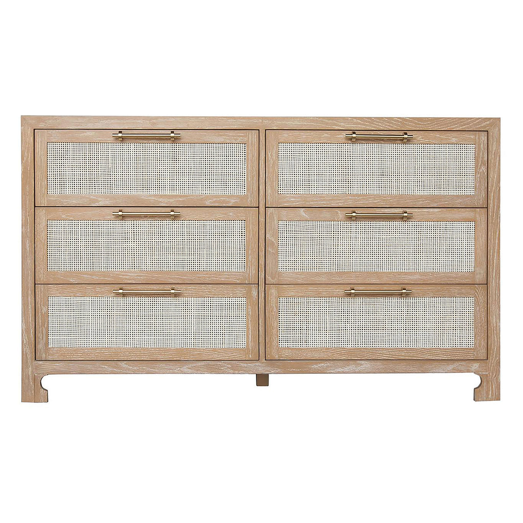 Give your bedroom or guestroom a stylish storage space with this dazzling chest from Worlds Away. On a simple silhouette, bold geometric details invite attention for a gorgeous statement. Drawers open to provide storage. British West Indies style with a modern flair, this extraordinary Worlds Away 6 drawer chest showcases natural, hand-woven caning on a rich, cerused oak, matte grey or matte white canvas.  The result – a sublime composition that embodies casual elegance. Whether placed in a coastal retreat or downtown loft, Carla complements any design motif.