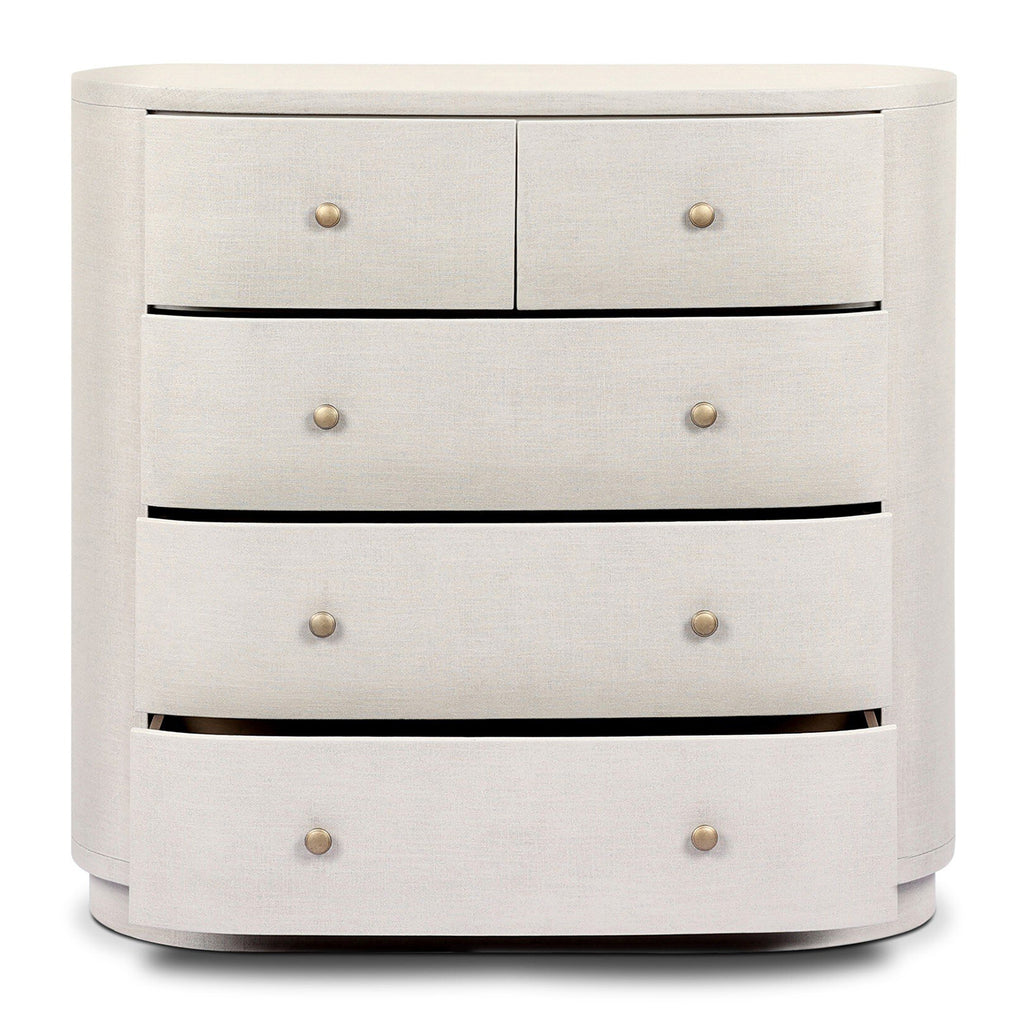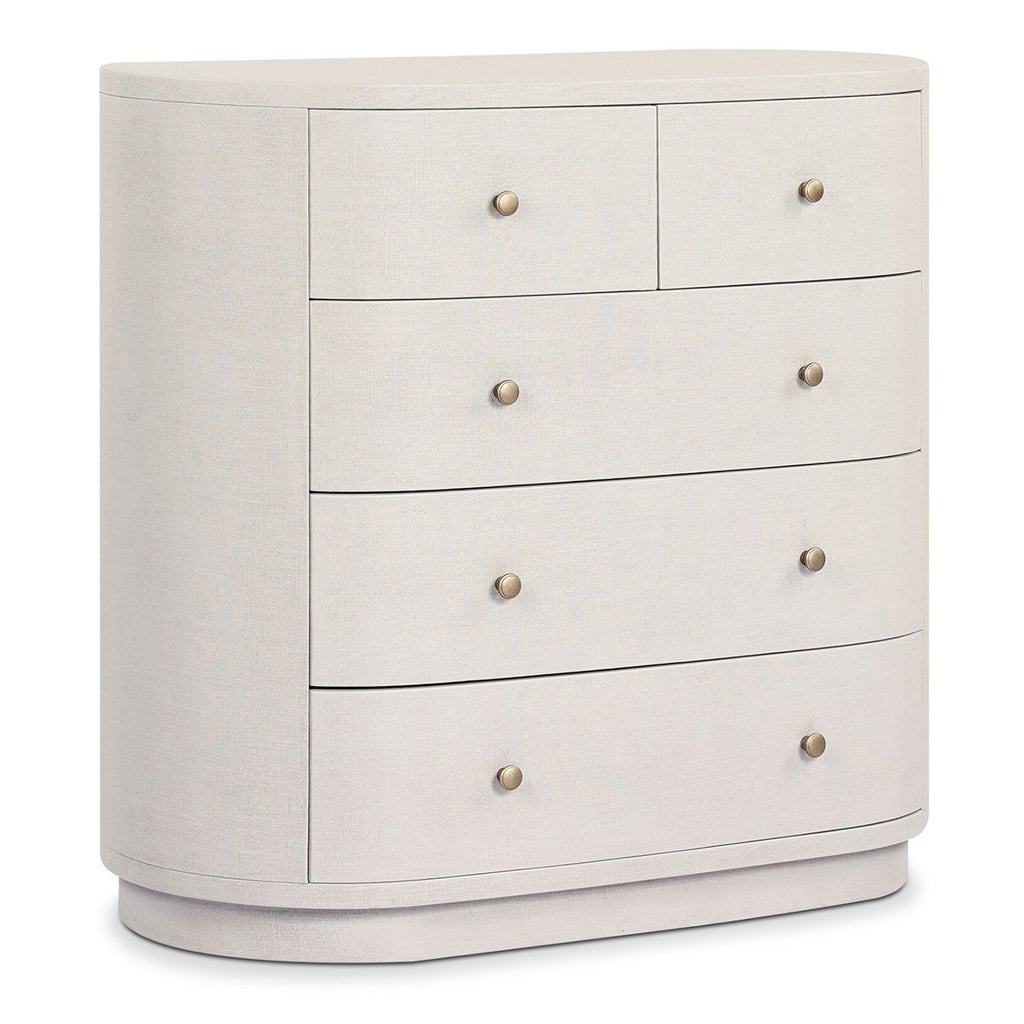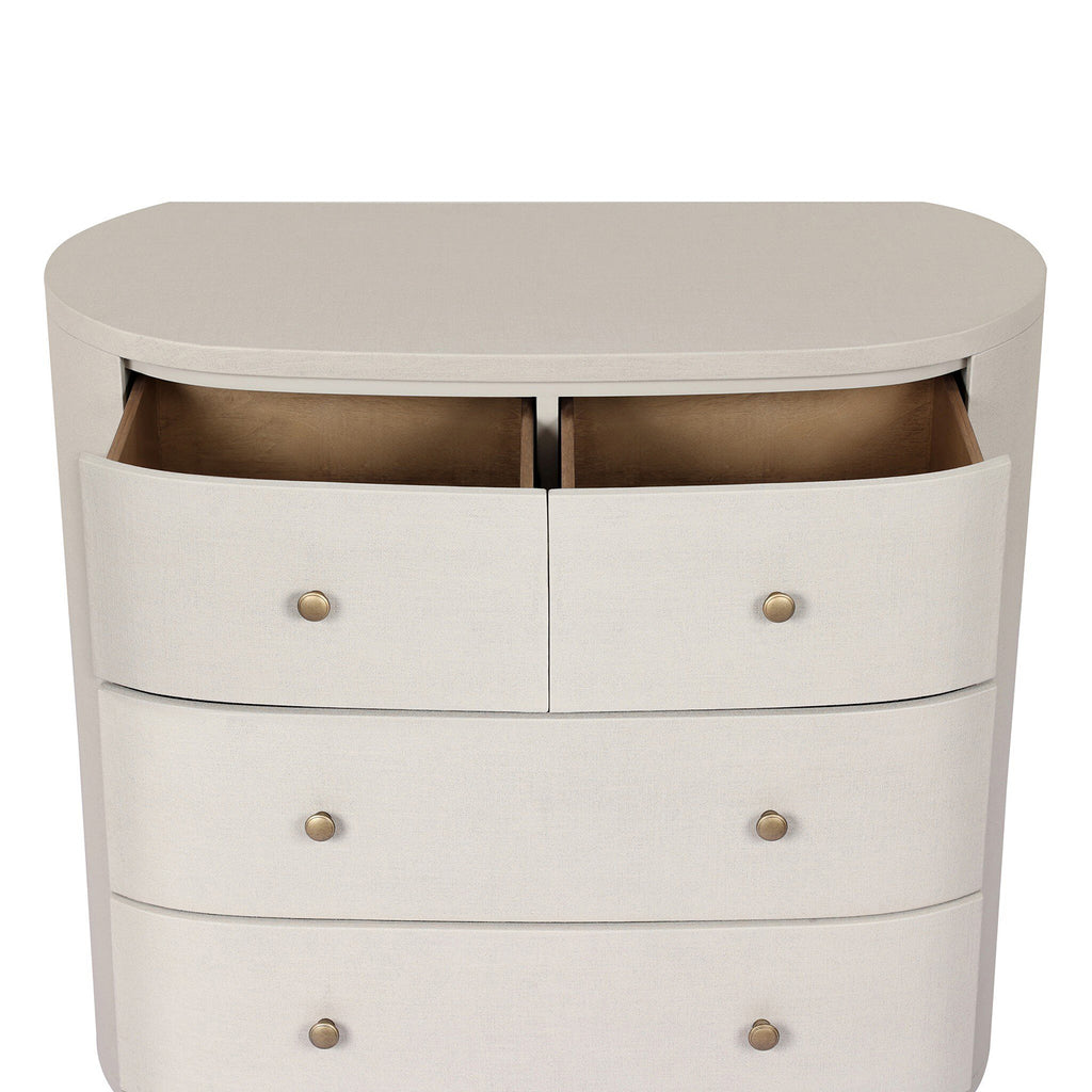 Uniquely made from ivory-painted linen, a beautifully curved drawer chest gives shape to generous storage for clothes, accessories and more.