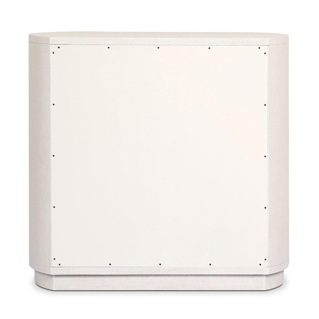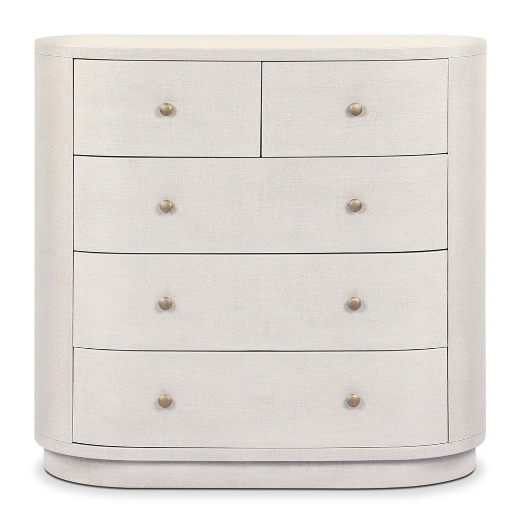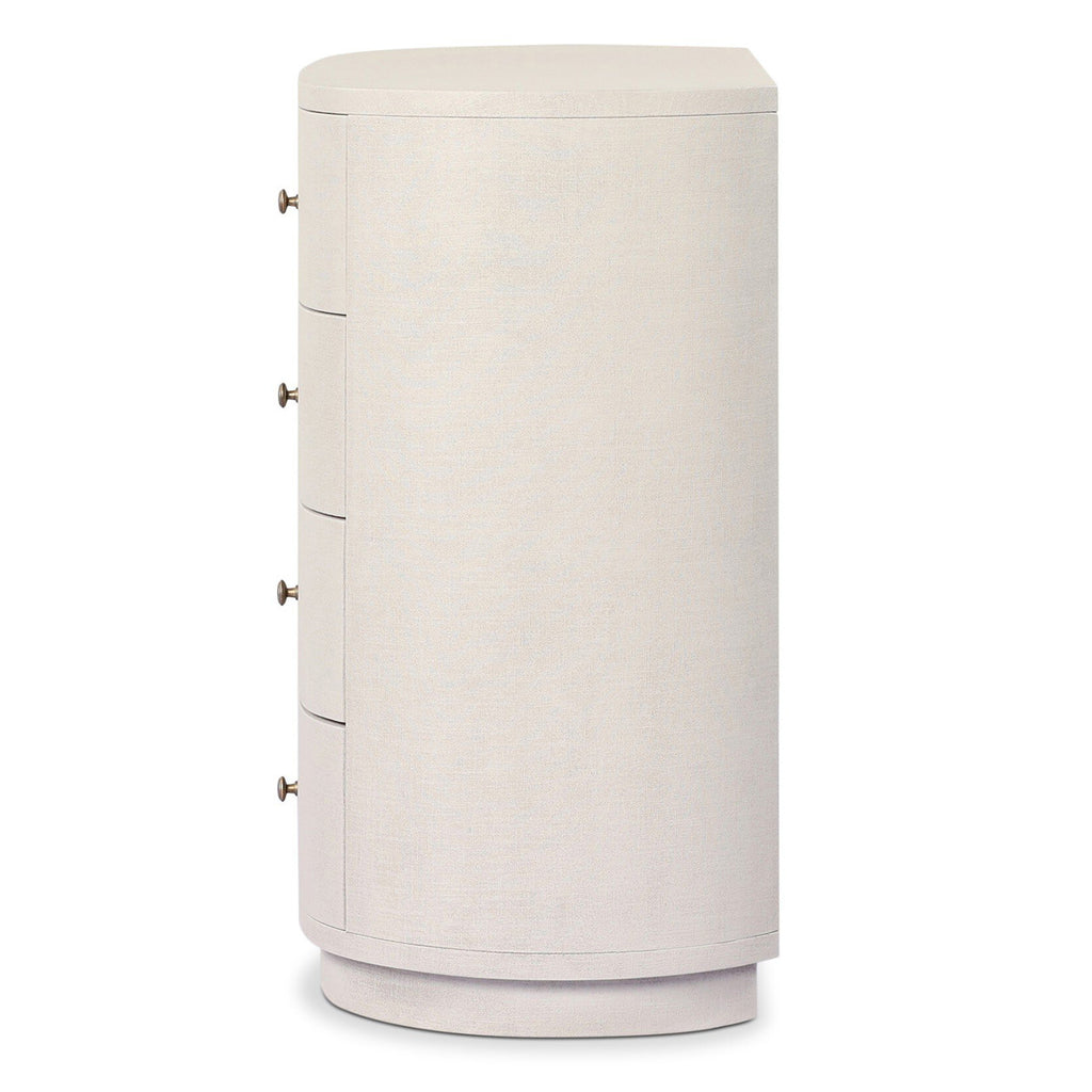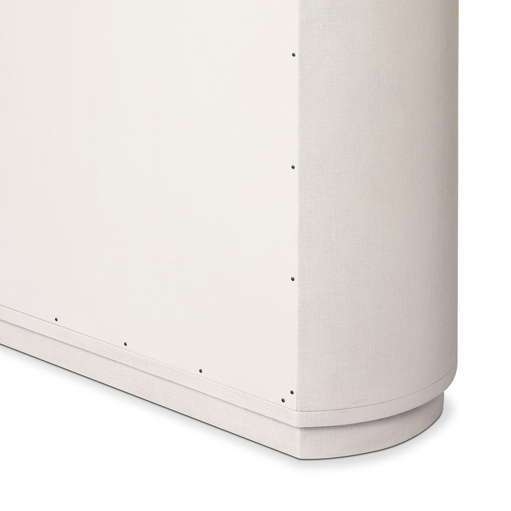 Uniquely made from ivory-painted linen, a beautifully curved drawer chest gives shape to generous storage for clothes, accessories and more.