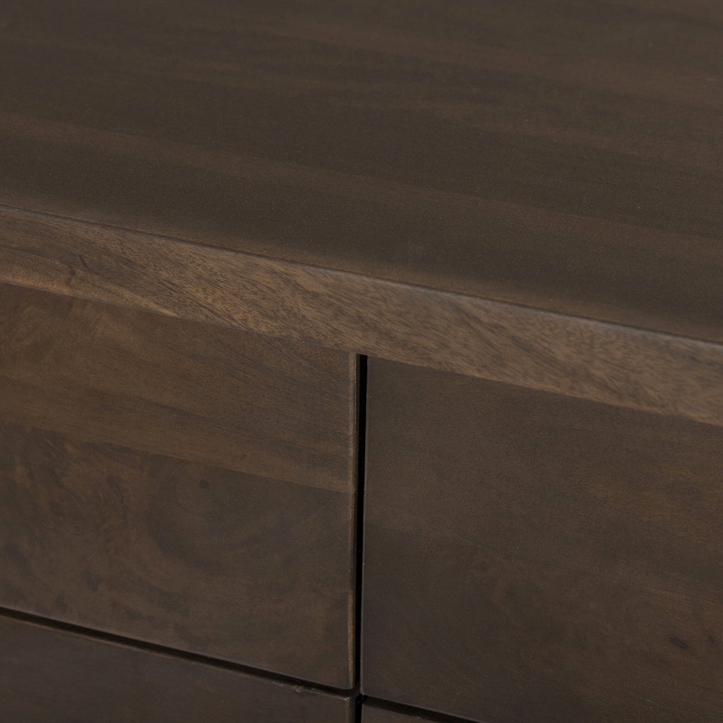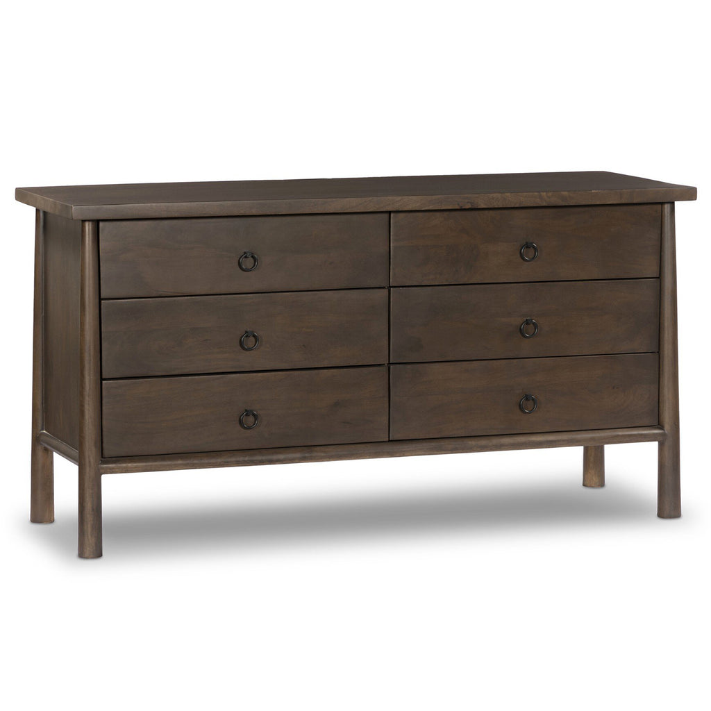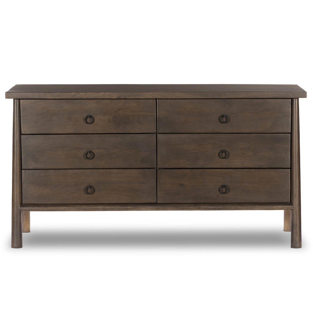 Inspired by French antique design, this dresser stands on round tapered legs with a prominent overhang top. Made of mango wood with cast iron key ring pulls, six drawers make it a versatile addition to the bedroom.