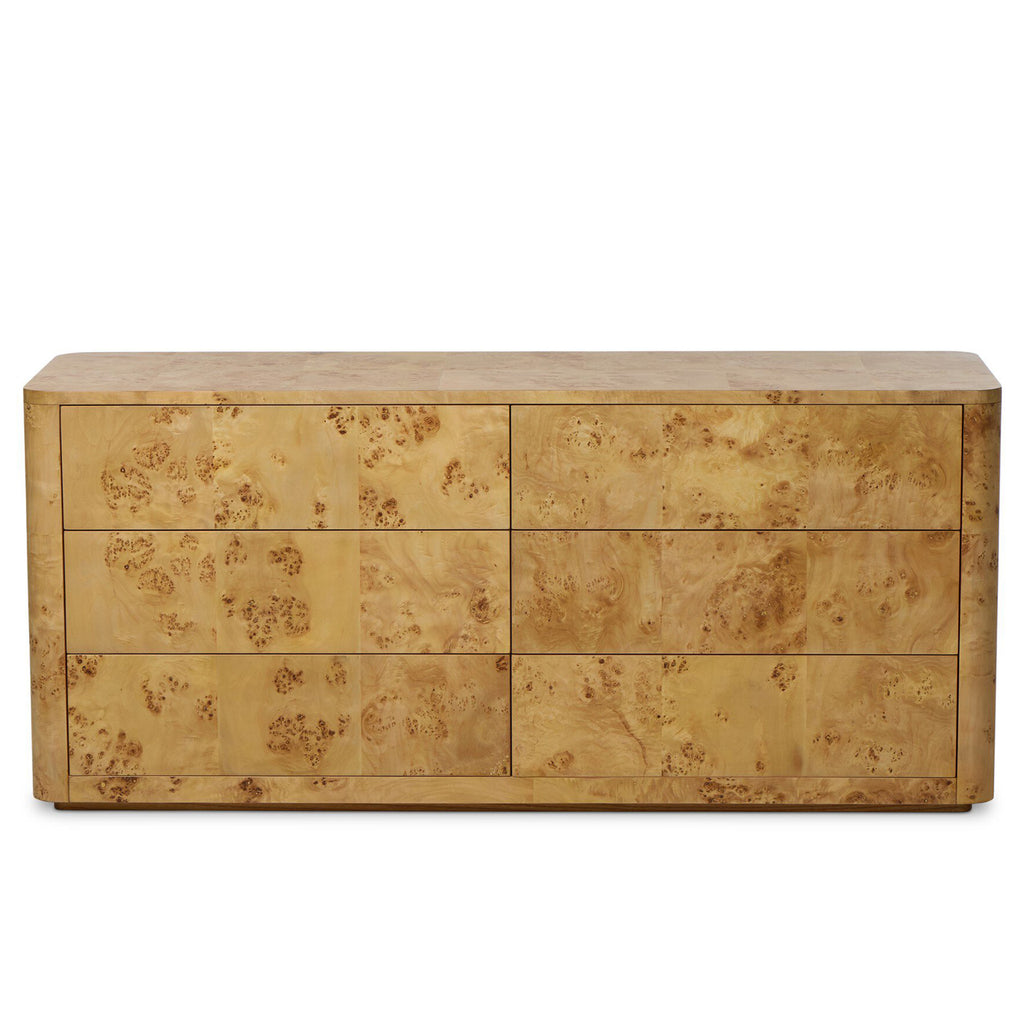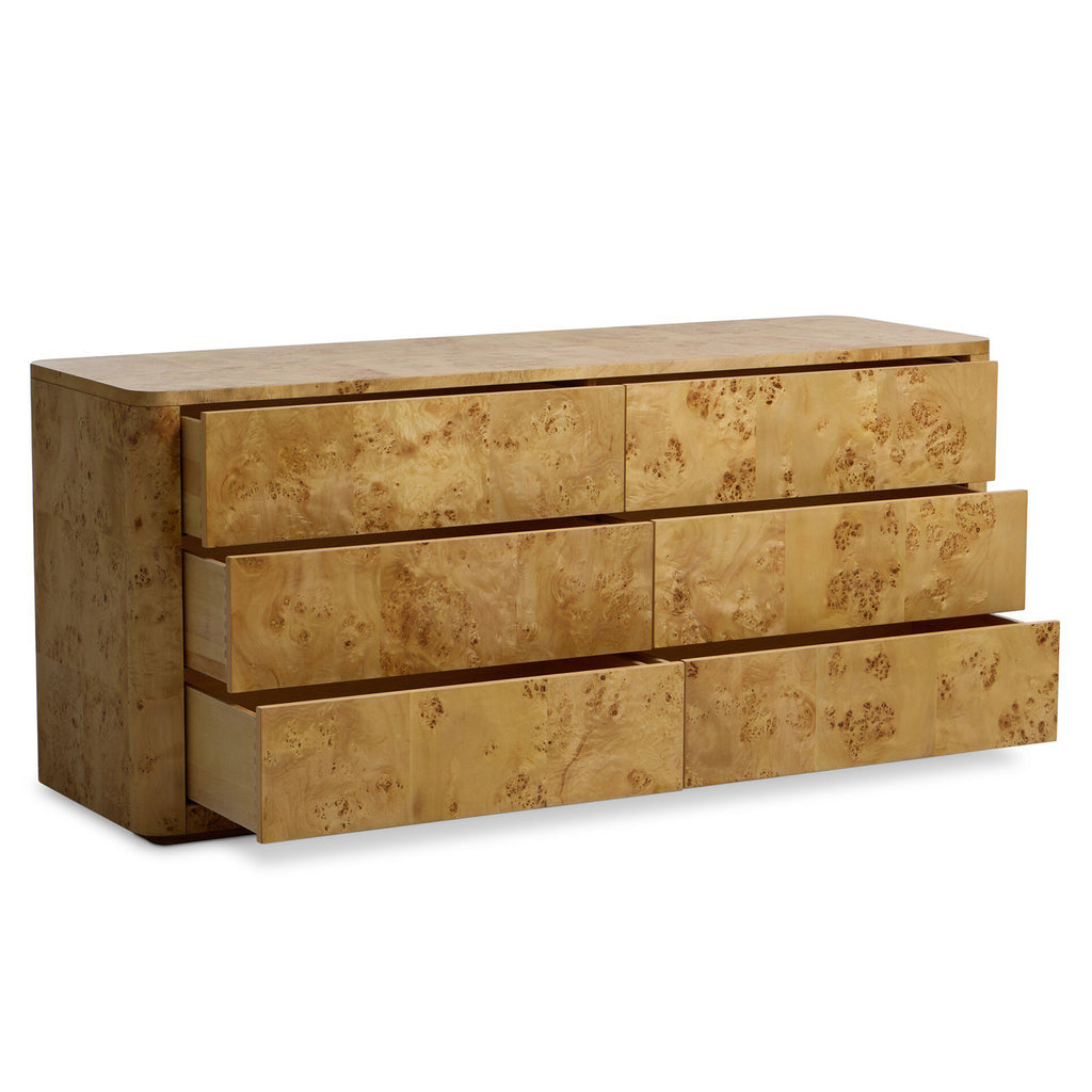 A simple, understated shape keeps this piece's spotlight on its unique swirling pattern. All-natural poplar is beautifully finished to amplify the organic shading with all its highs and lows. The dresser includes six drawers. Each piece is completely unique with variations in color and pattern inherent to the wood.
