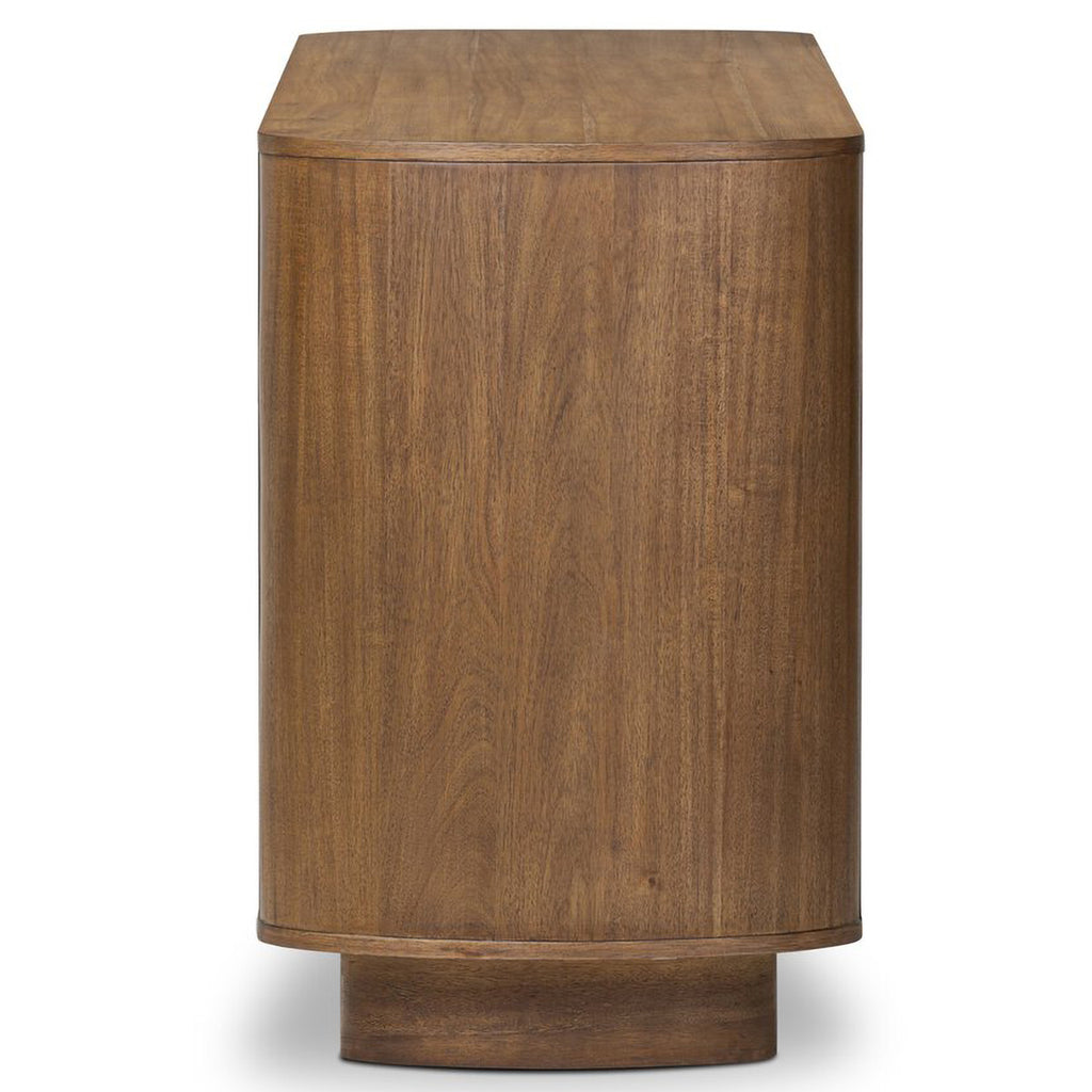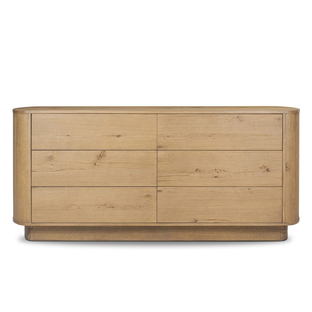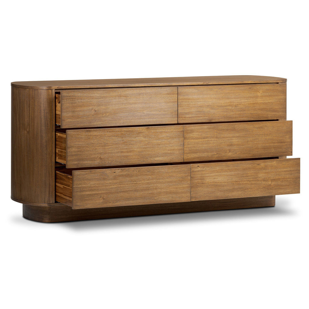 Seasoned brown acacia forms a pedestal base, bringing gentle curves to a classic dresser shape. Six drawers bring spacious storage to the bedroom.