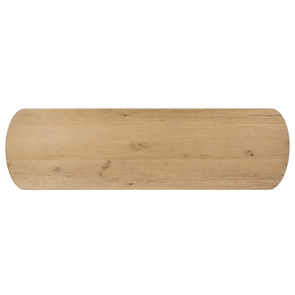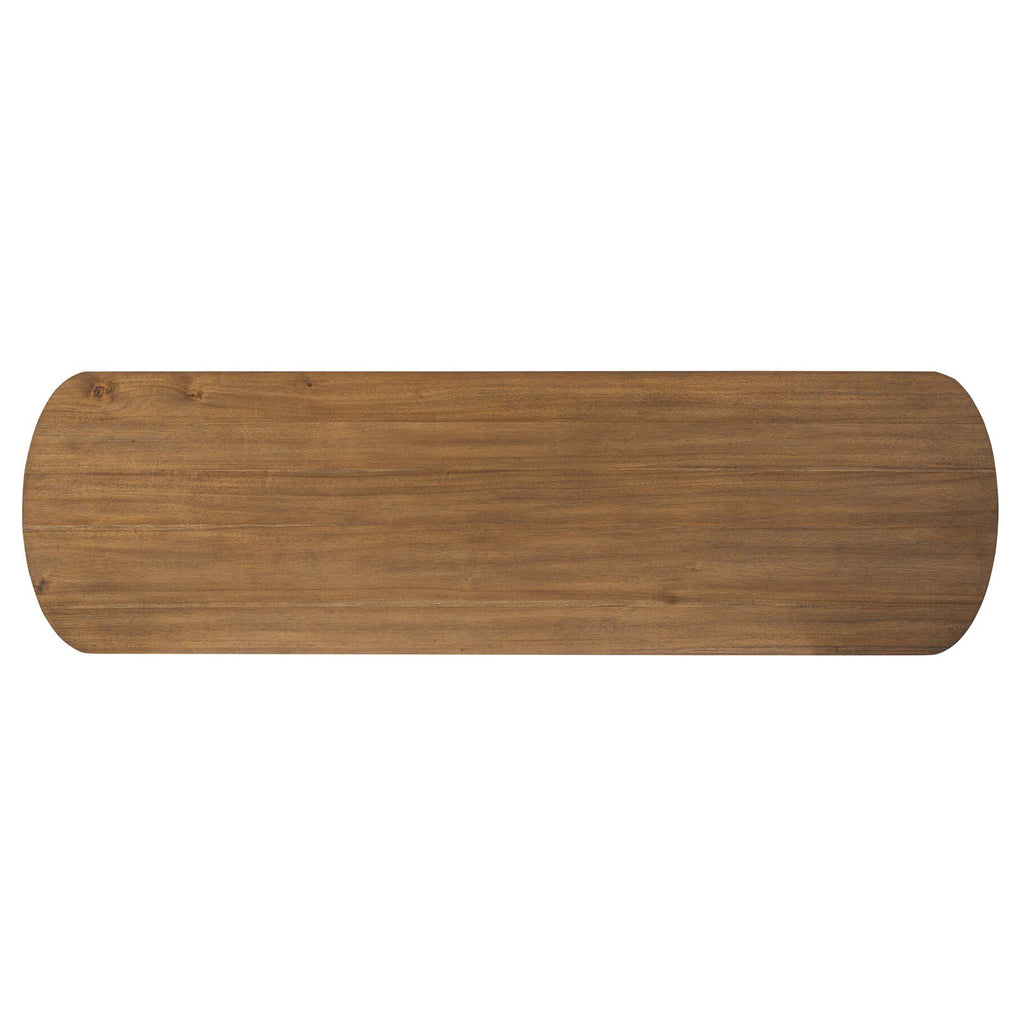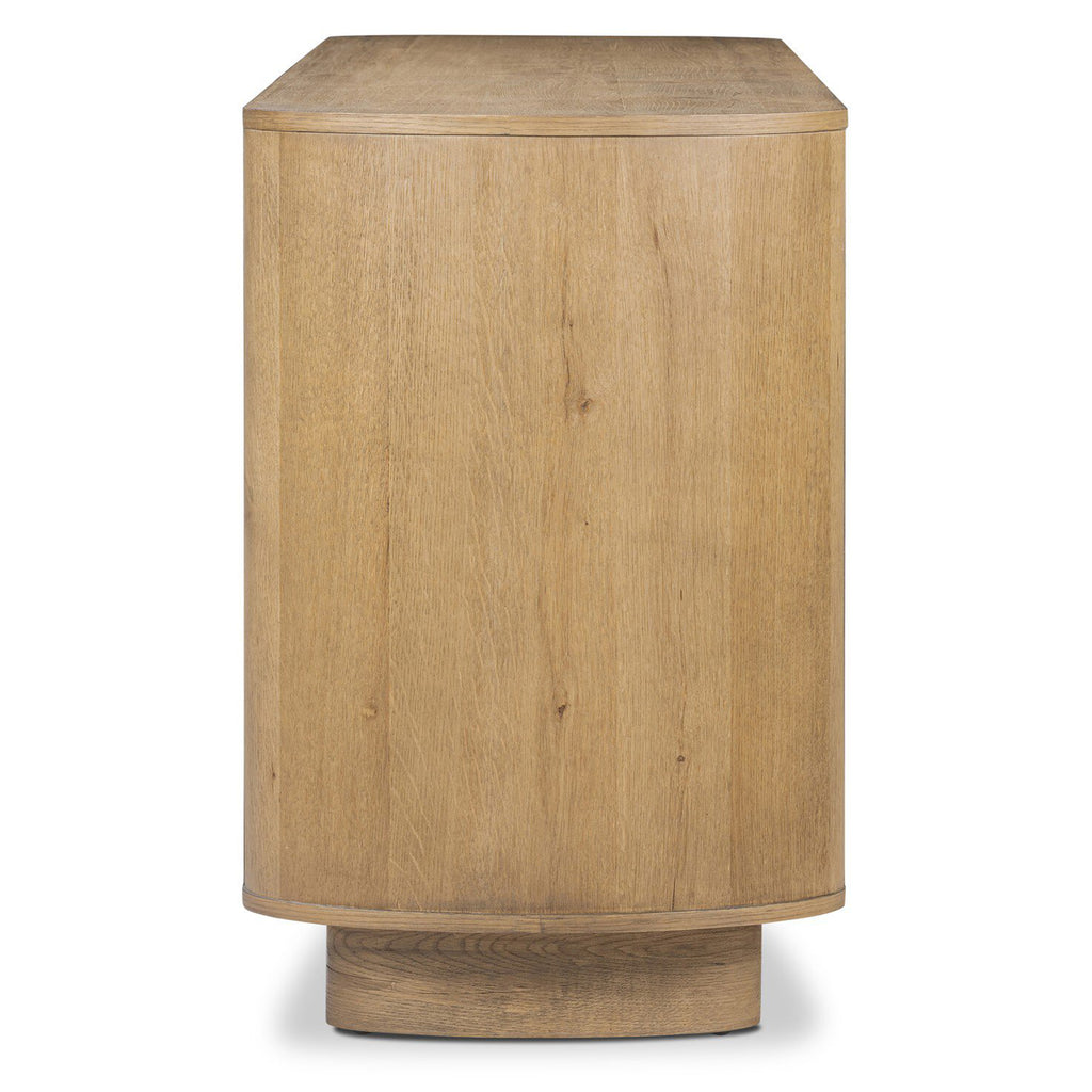 Seasoned brown acacia forms a pedestal base, bringing gentle curves to a classic dresser shape. Six drawers bring spacious storage to the bedroom.