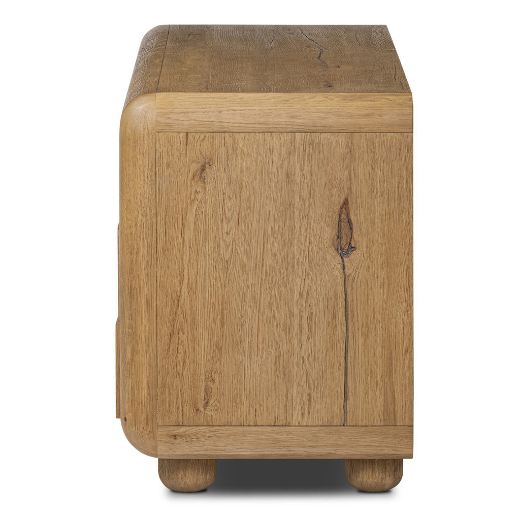 Blending modern design with classic features, this dresser is at once soft and bold. Set low to the ground on rounded feet, the dresser has prominent rounded corners that emphasize its smooth finish. Crafted from solid warm oak and veneers with push-latch hardware for a clean front.