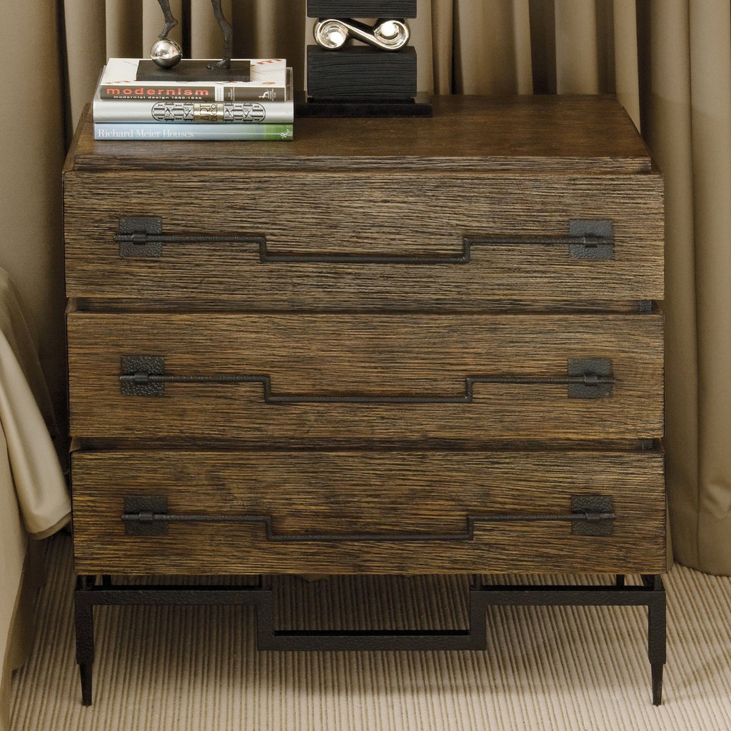 The Global Views Scratch 3 drawer chest is made of solid mango wood and hand wrought iron. Wood has a dark stained, hand scratched finish with a satin lacquer top coat. Metal has a hammered black powder coated finish. Three 8in H drawers. Oversized hand wrought iron drawer pulls. Hand wrought iron base.