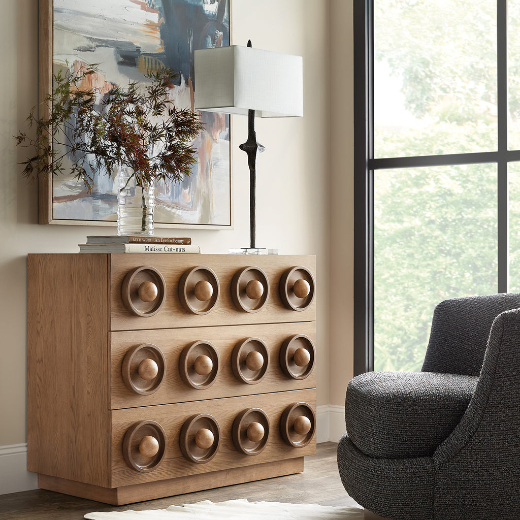 With a chic Bohemian flair, the Knobby 3-Drawer Accent Chest has round contrasting dark wood backplates and large round wood knobs across each of the three drawers. Crafted of White Oak in a light wood finish, it has a plinth base.