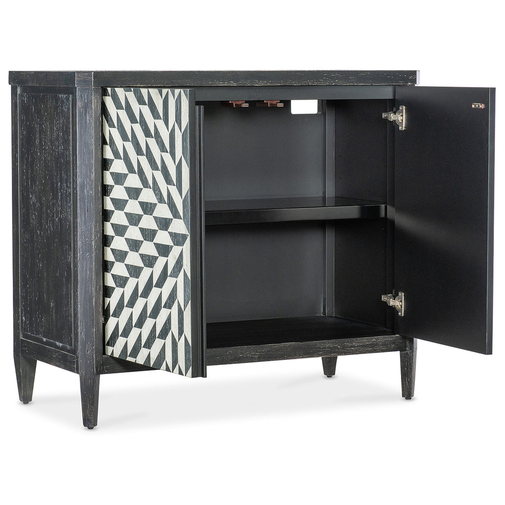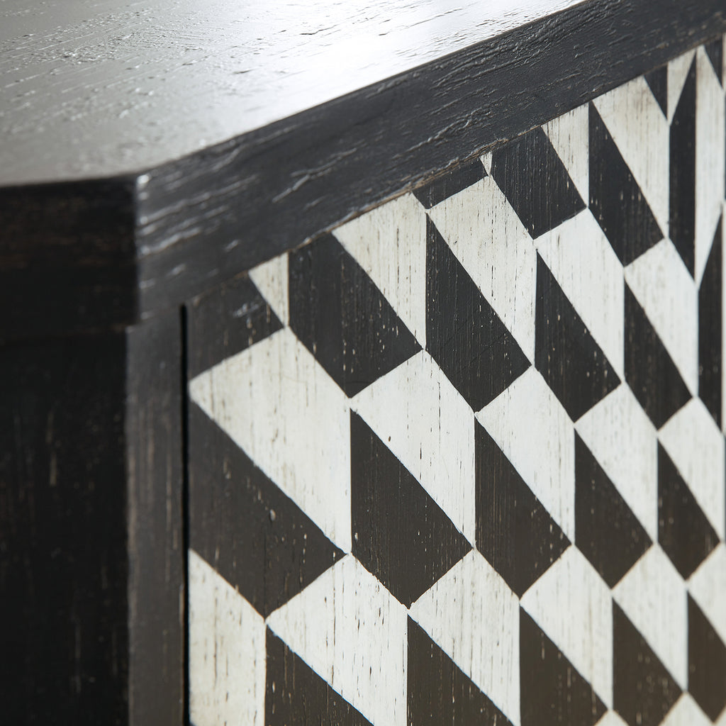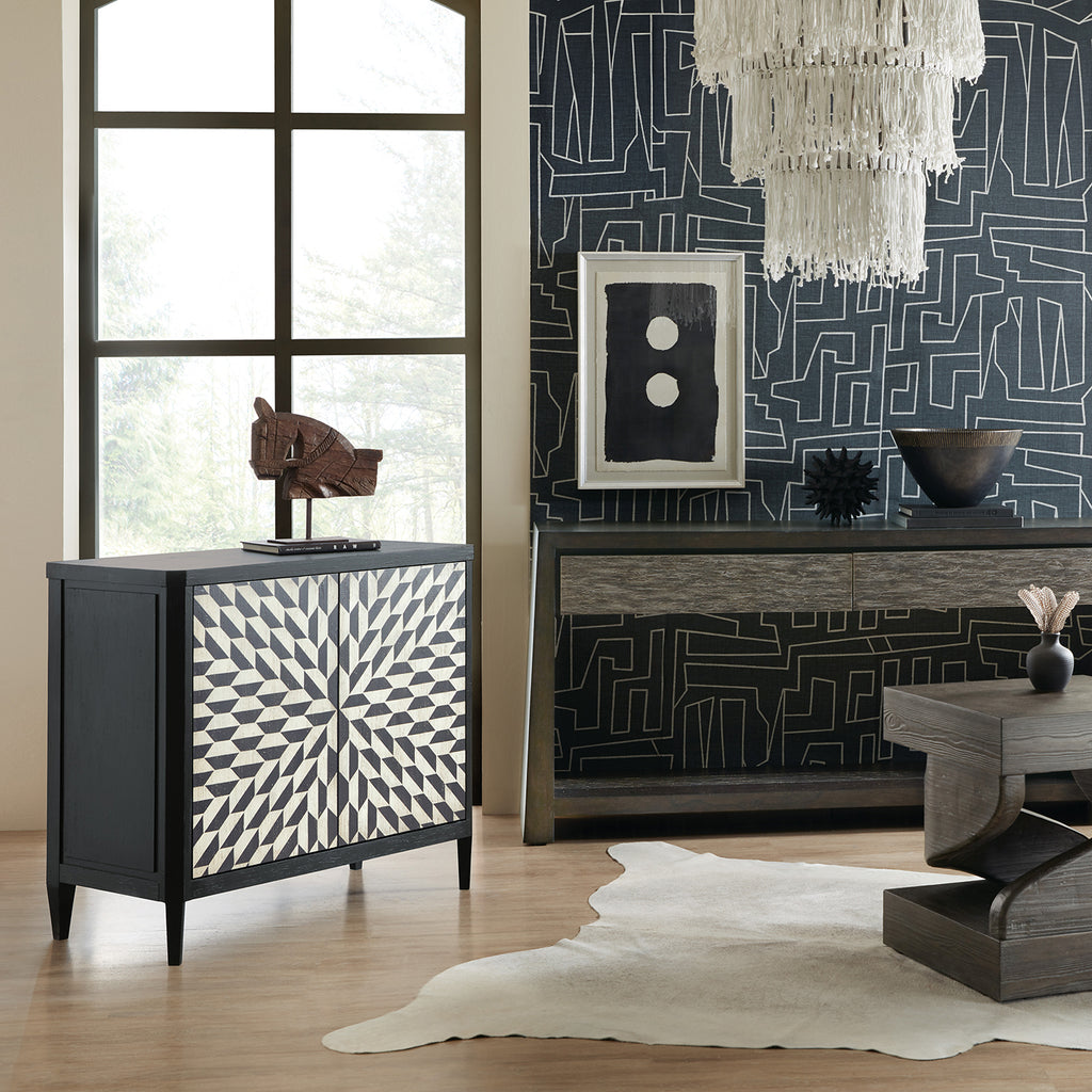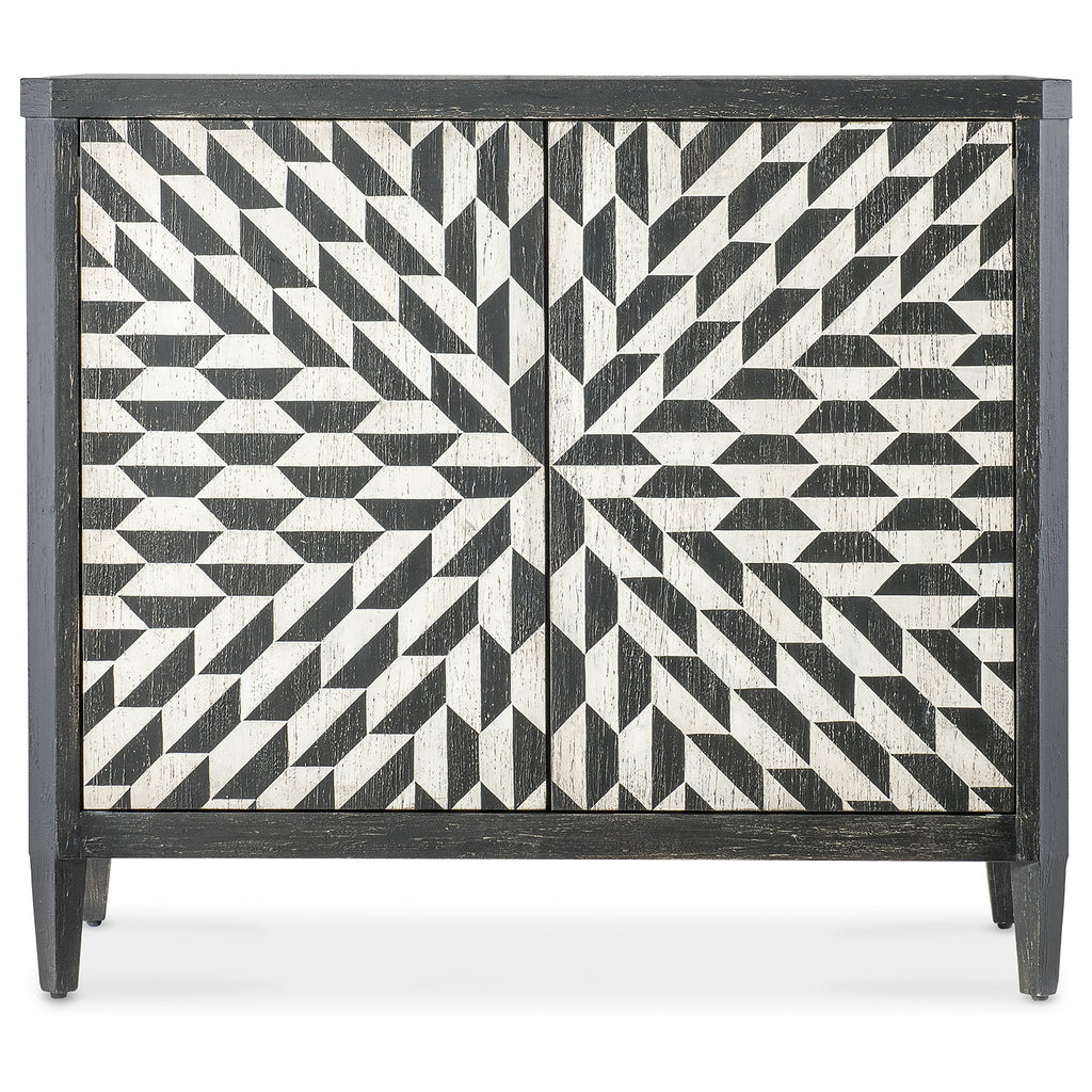 The Lancaster Hall Chest offers the classic and always-stylish black & white combination and timeless painted starburst pattern on the door fronts. Crafted of Maple Veneers, the two doors have soft-close hinges and magnetic door catches with one adjustable shelf the doors.