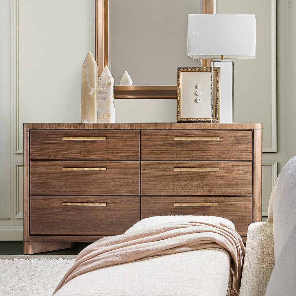 The Eleana Dresser exudes timeless sophistication with its Light Caramel walnut veneer finish and plated Sunlit Bronze hardware. Designed with six self-closing drawers, a jewelry tray, and cedar-lined bottom drawers, it offers elegant organization. Soft, rounded corners enhance its sculptural silhouette, making it a standout piece for transitional bedrooms. Marrying sculptural refinement with an effortless sense of luxury, the Eleana collection is a masterclass in contemporary elegance. The series, imbued with an effortless sense of sophistication, where sculptural silhouettes meet richly textured materials to create pieces that feel at once timeless and of the moment. Versatile in both scale and sensibility, Eleana's thoughtful proportions and nuanced finishes bring a sense of depth and harmony, lending itself seamlessly to a range of interiors, from intimate city dwellings to expansive retreats. Infused with a relaxed yet polished sensibility, Eleana embodies the essence of modern living; stylish, inviting, and intuitively crafted for the way we live today.