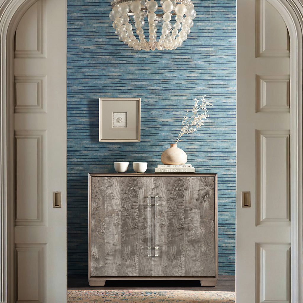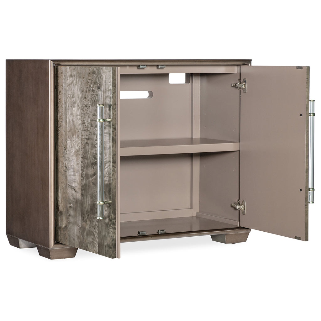 Figured Burl and Maple Veneer are dyed a shimmery soft brown and accented by acrylic and metal door pulls to create earthy elegance in the Dorian Accent Chest. The two doors open with magnetic catches and reveal one adjustable shelf behind, and a smoothly- painted interior. Measures 41 inches wide by 19 inches deep.