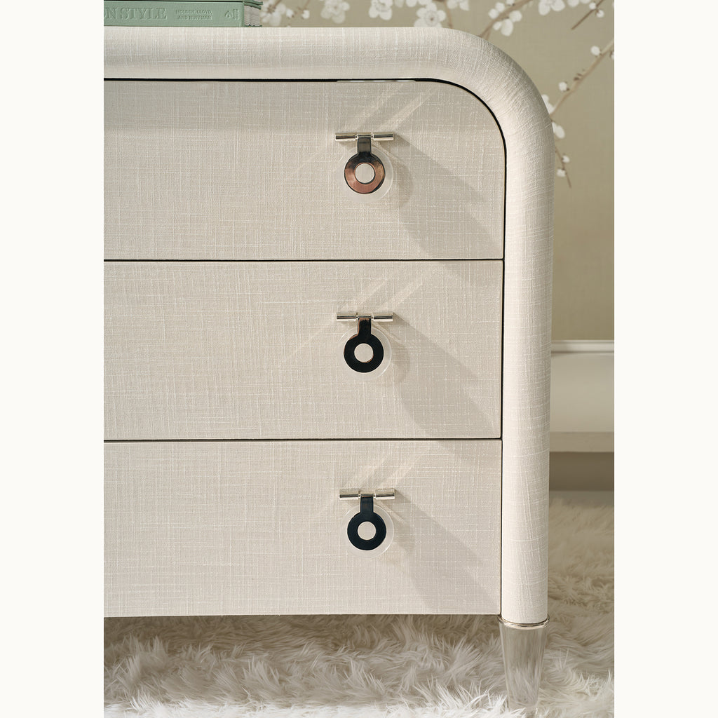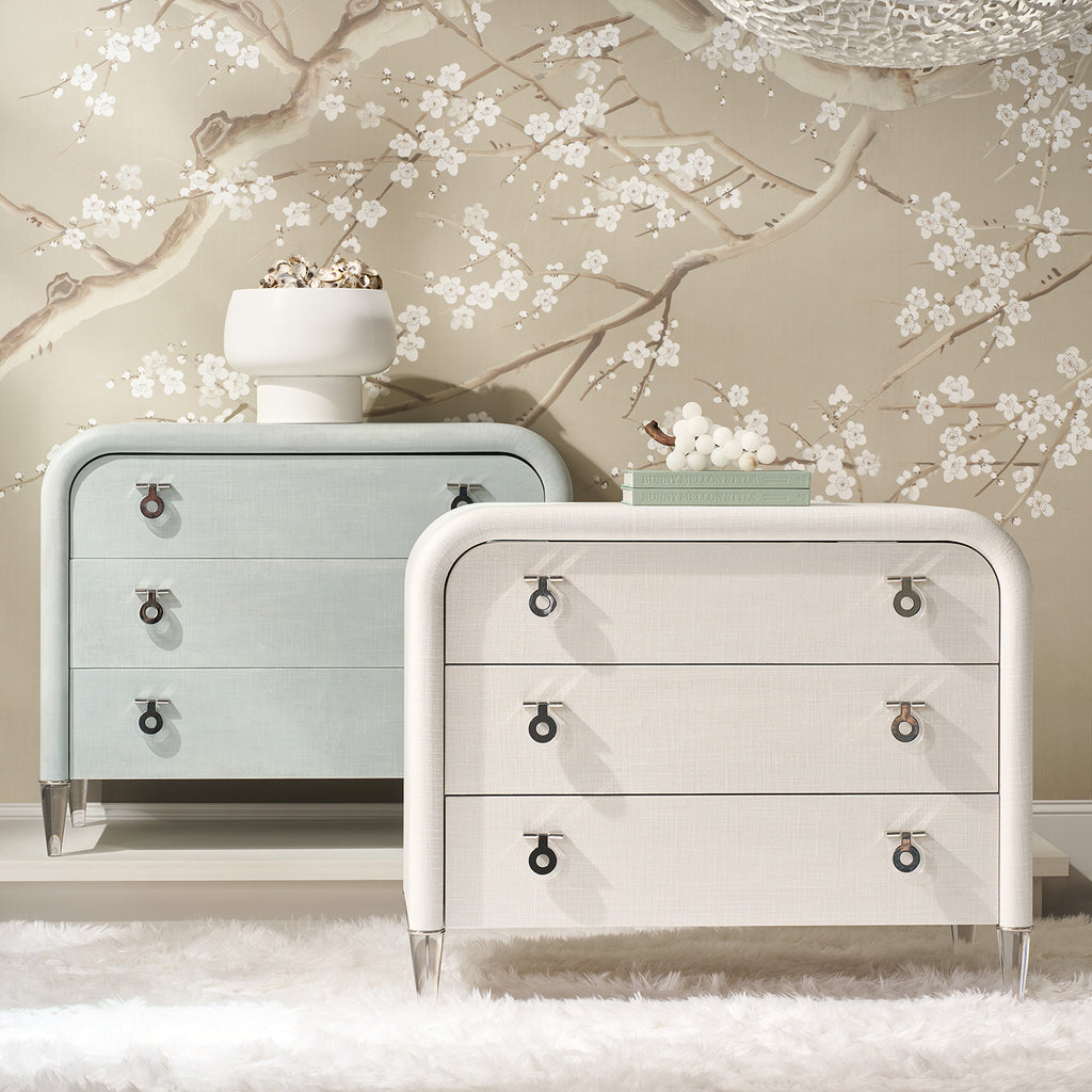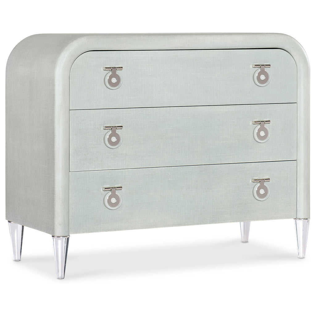 With an understated modern elegance, the Julip Accent Chest is designed with a clean silhouette, clear acrylic legs and silver chrome-colored metal accents. With a linen-wrapped exterior and drawer fronts and rounded corners, it has chrome-hued, jewelry-like metal drop pulls and three self-closing drawers.