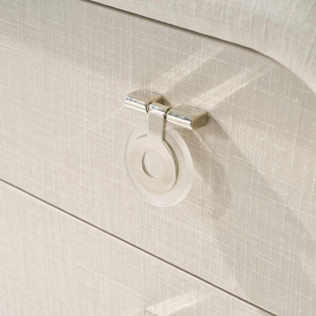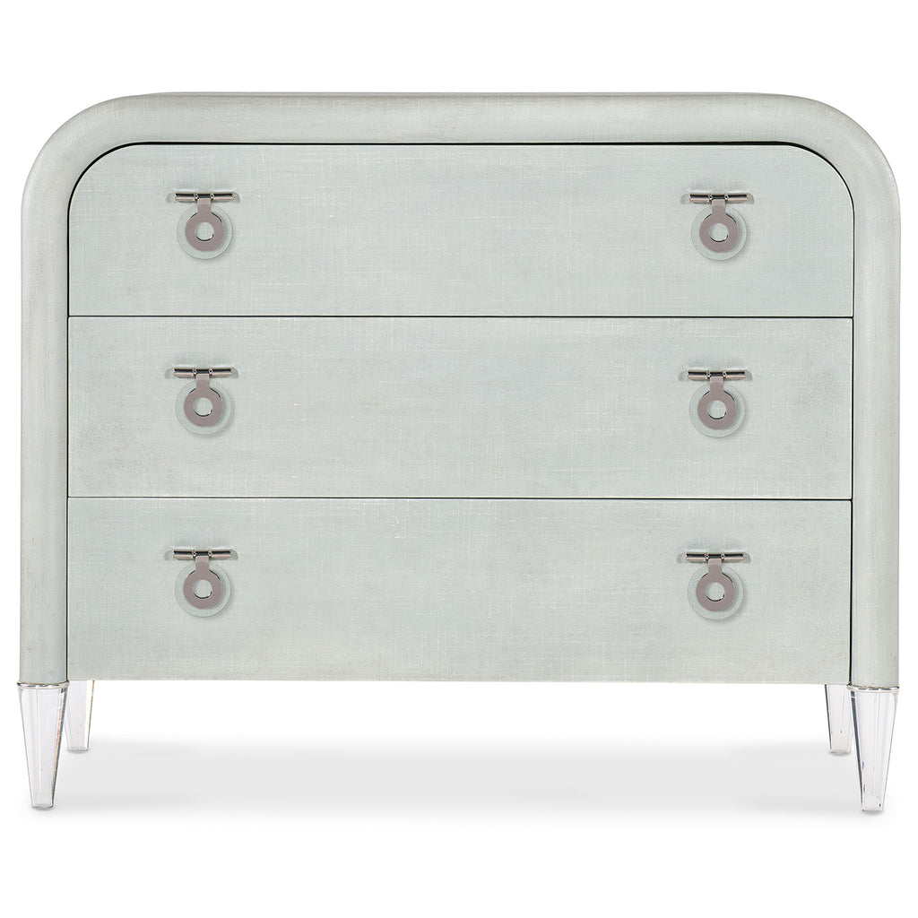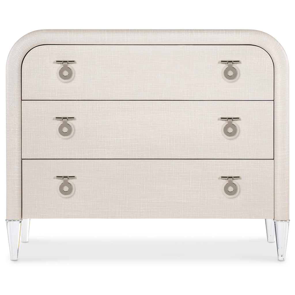 With an understated modern elegance, the Julip Accent Chest is designed with a clean silhouette, clear acrylic legs and silver chrome-colored metal accents. With a linen-wrapped exterior and drawer fronts and rounded corners, it has chrome-hued, jewelry-like metal drop pulls and three self-closing drawers.