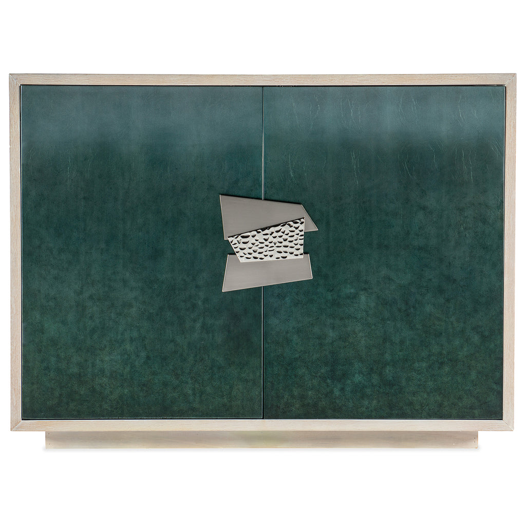 Bold, sleek and intriguing, the Natalee Two-Door Chest is a stunning and stylish silhouette combining Cerused White Oak with green ombre leaf doors and hammered three-tiered hardware in a brushed nickel finish. Behind the doors is one adjustable shelf.