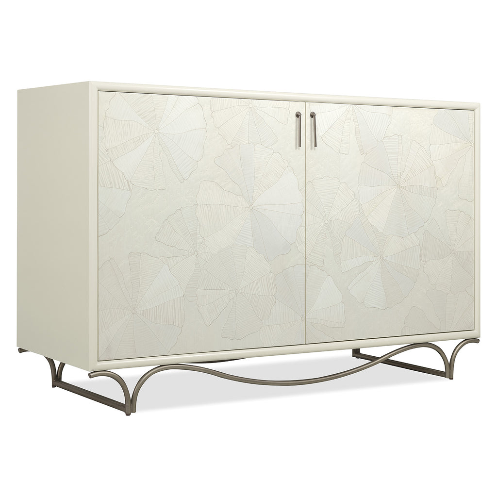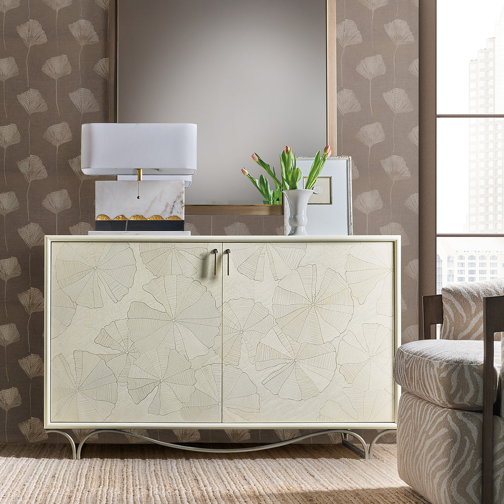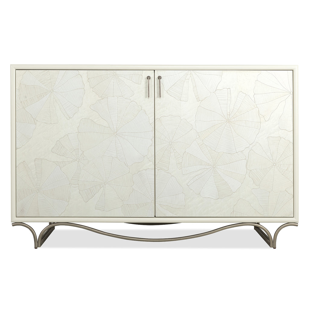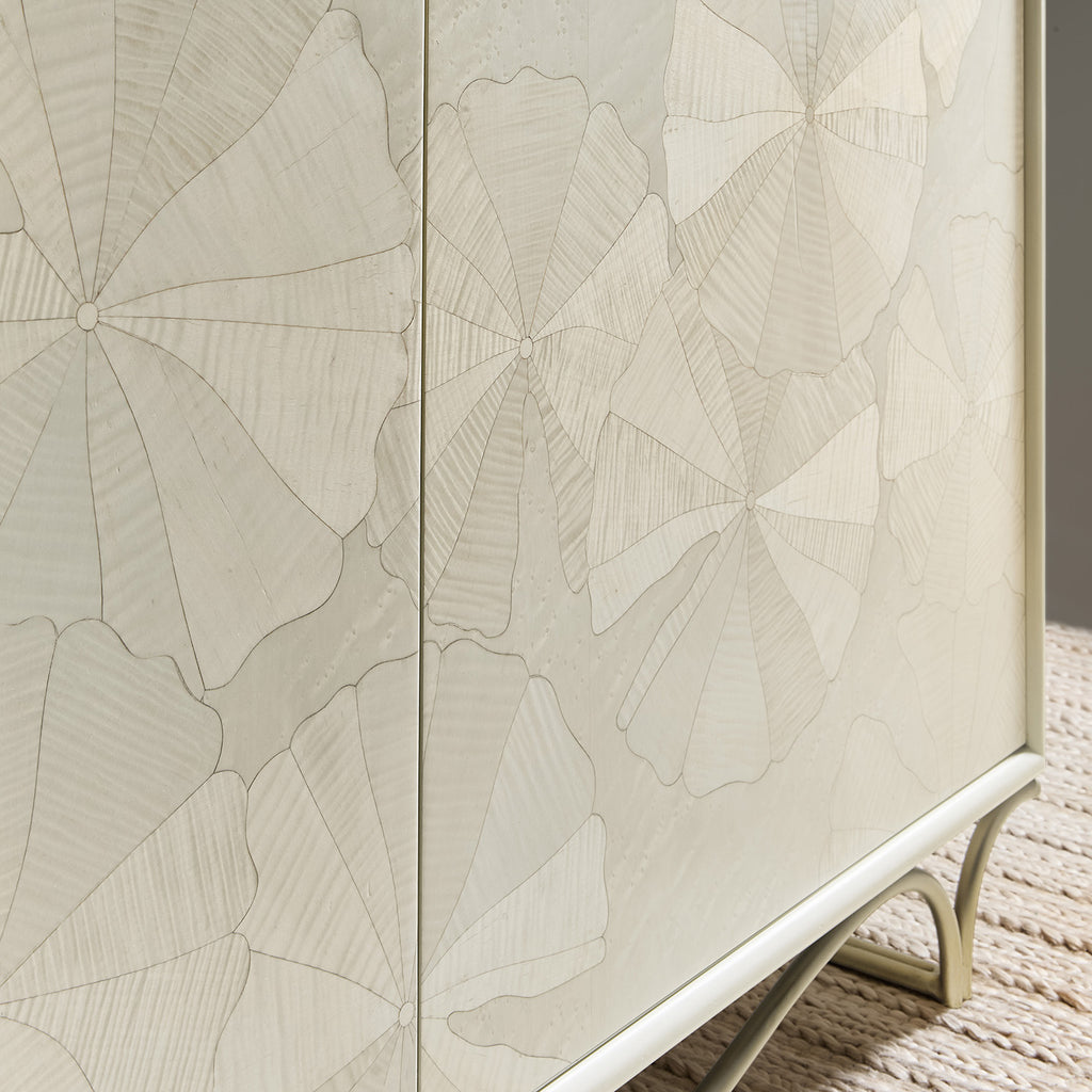 • Finish: White/Creams/Beige painted finish with white lily pad marquetry on door fronts and gray metal base