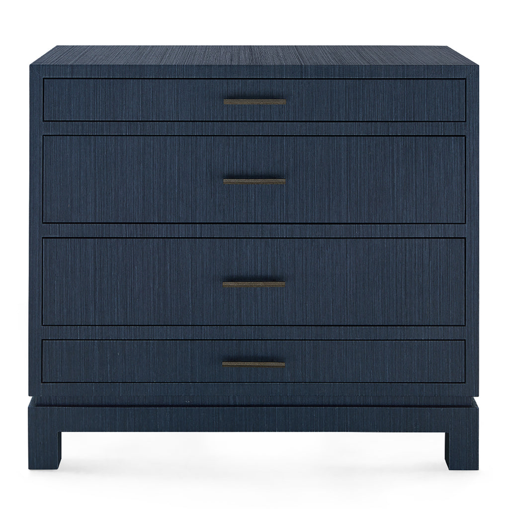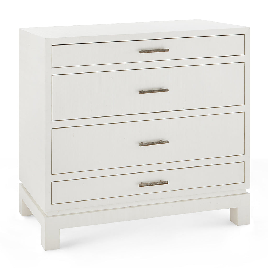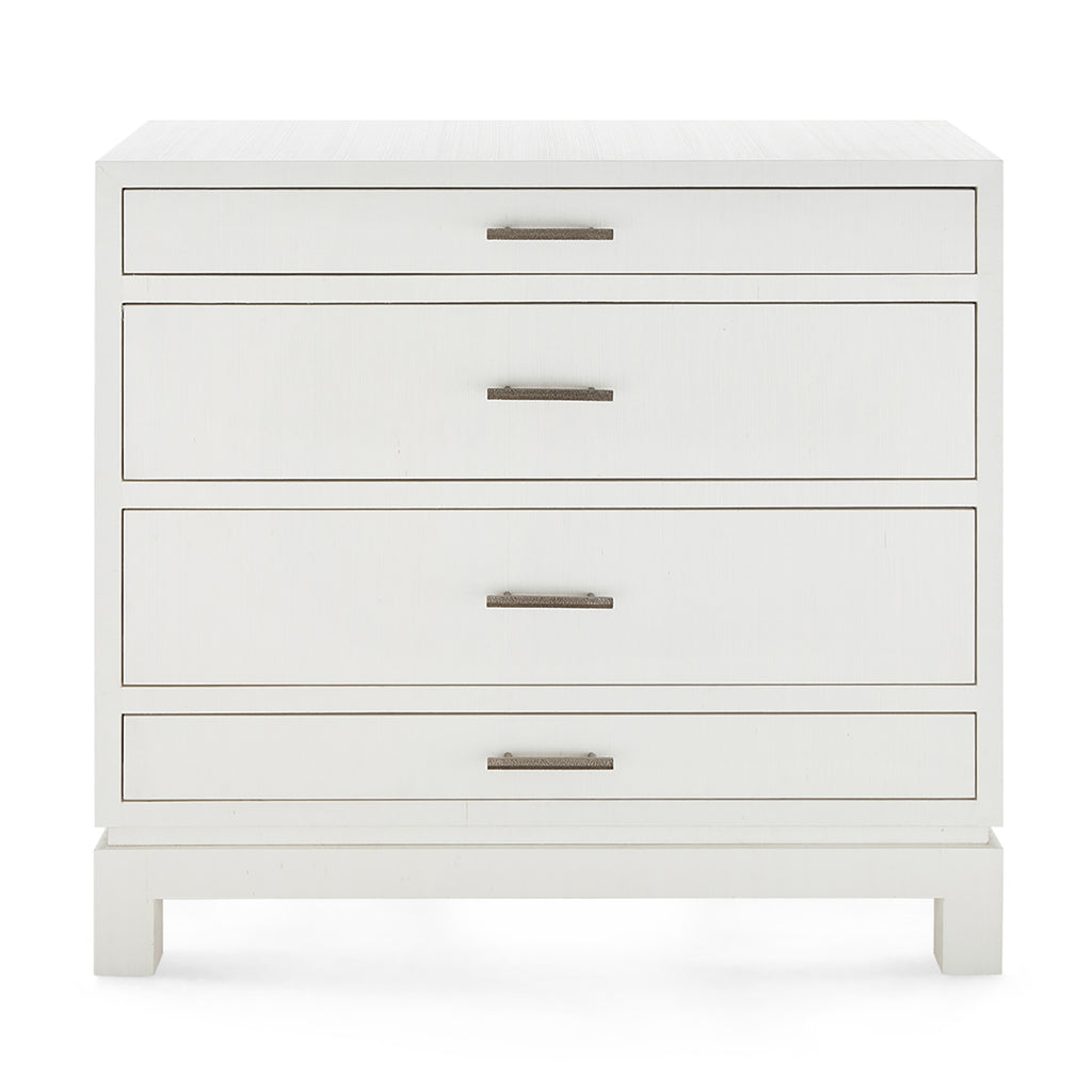 The Villa & House Florence 4-Drawer Side Table showcases clean, rectilinear lines. The grasscloth-wrapped collection is coated in a clear lacquer finish, which highlights the natural texture and imparts a subtle sheen. Thoughtfully designed for both style and function, this spacious piece features four drawers that graduate in size—smaller, shallower drawers at the top for delicate items and deeper drawers below for larger items. With satin-finish bronze pulls, the dresser strikes a balance between tailored structure and refined warmth.