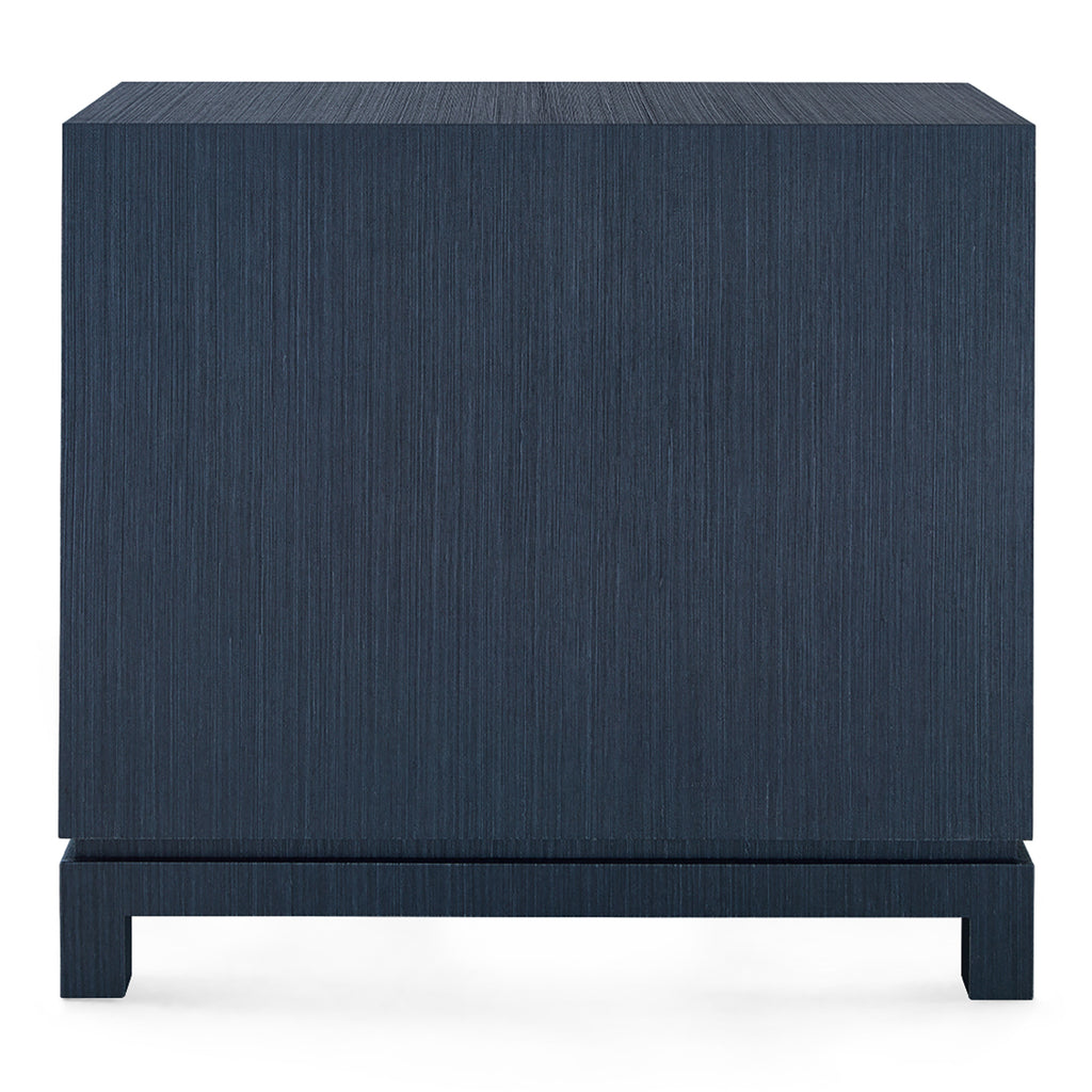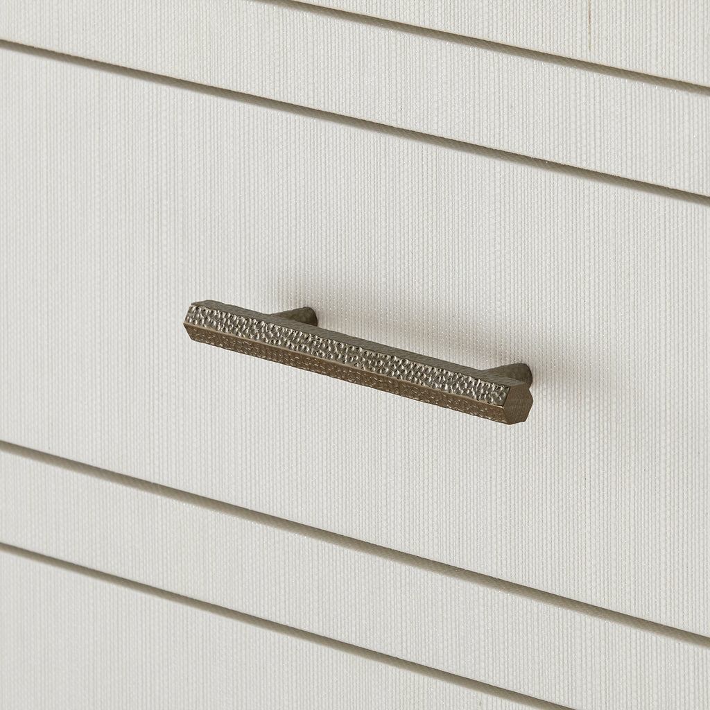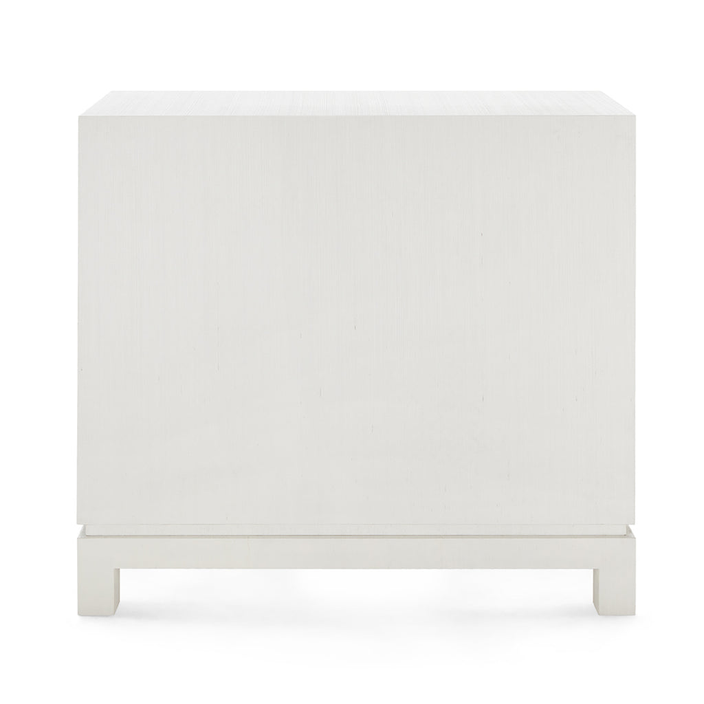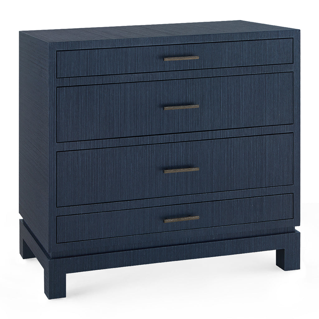 The Villa & House Florence 4-Drawer Side Table showcases clean, rectilinear lines. The grasscloth-wrapped collection is coated in a clear lacquer finish, which highlights the natural texture and imparts a subtle sheen. Thoughtfully designed for both style and function, this spacious piece features four drawers that graduate in size—smaller, shallower drawers at the top for delicate items and deeper drawers below for larger items. With satin-finish bronze pulls, the dresser strikes a balance between tailored structure and refined warmth.