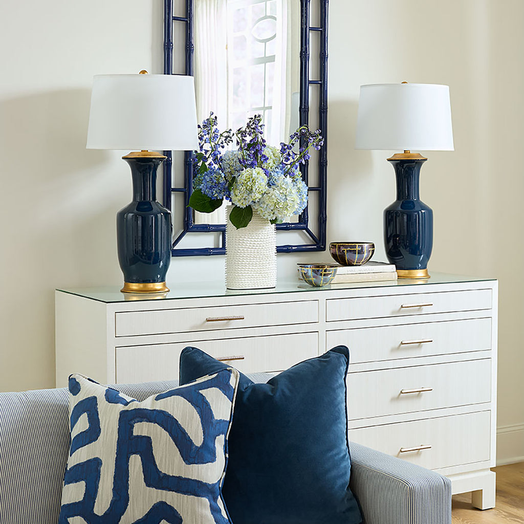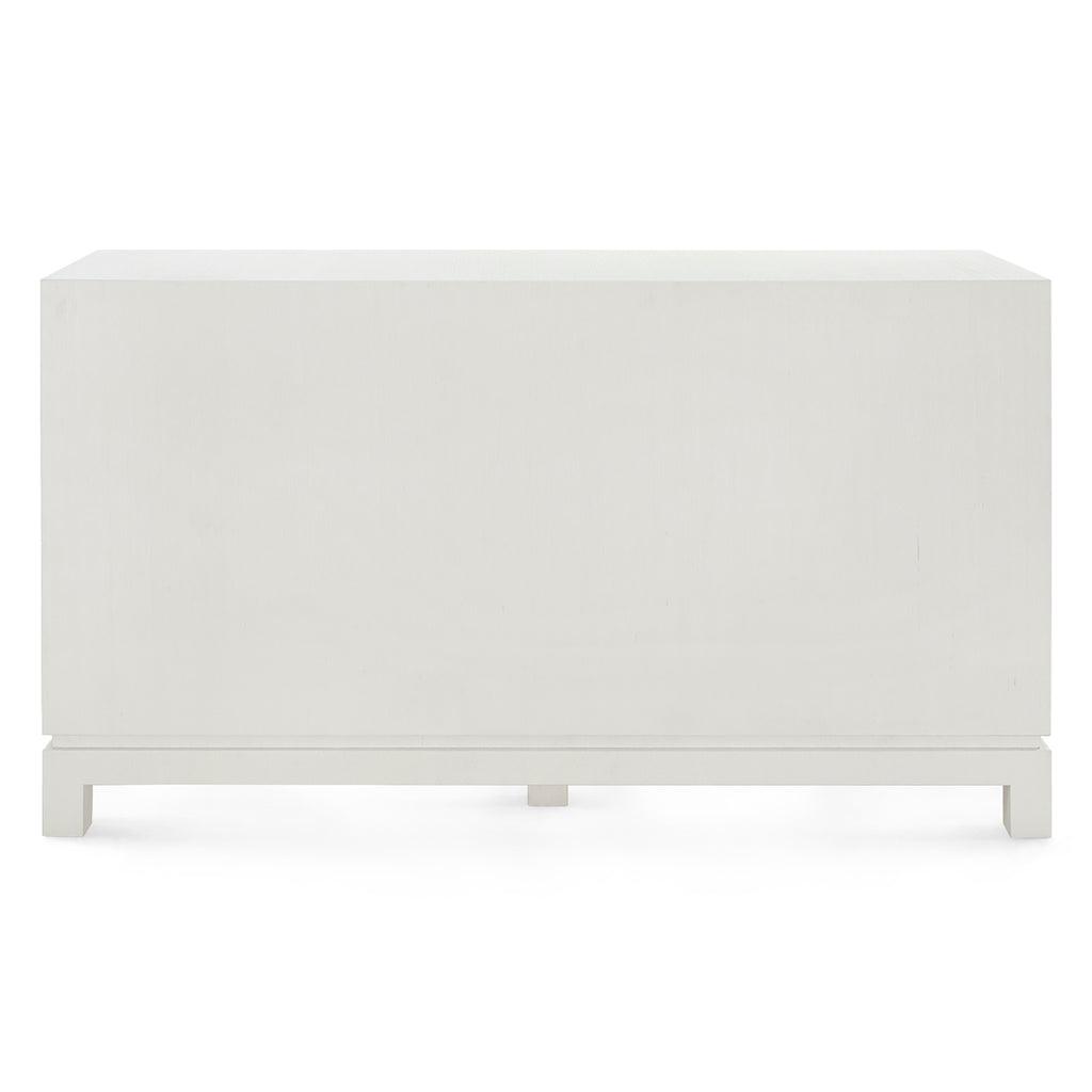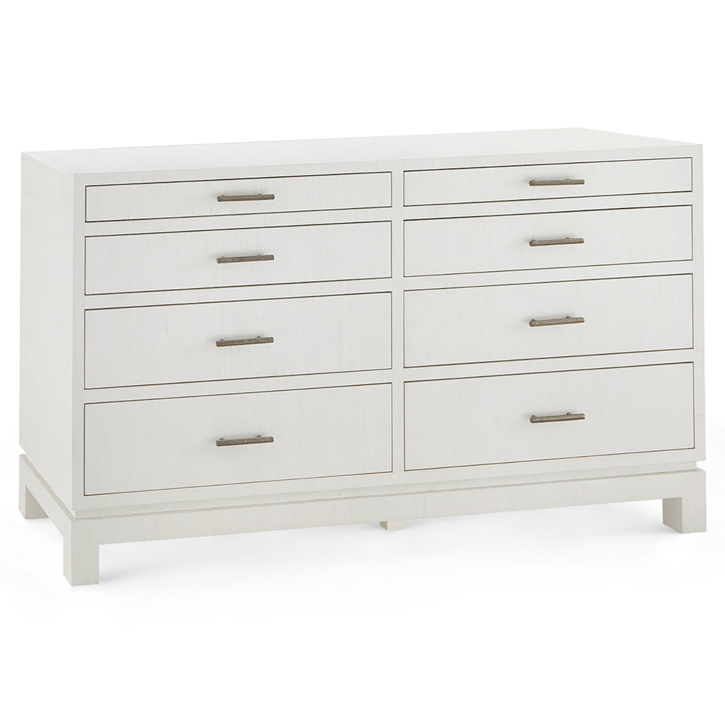 The Villa & House Florence Large 8-Drawer Dresser showcases clean, rectilinear lines. The grasscloth-wrapped collection is coated in a clear lacquer finish, which highlights the natural texture and imparts a subtle sheen. Thoughtfully designed for both style and function, this spacious piece features eight drawers that graduate in size—smaller, shallower drawers at the top for delicate items and deeper drawers below for larger items. With satin-finish bronze pulls, the dresser strikes a balance between tailored structure and refined warmth.