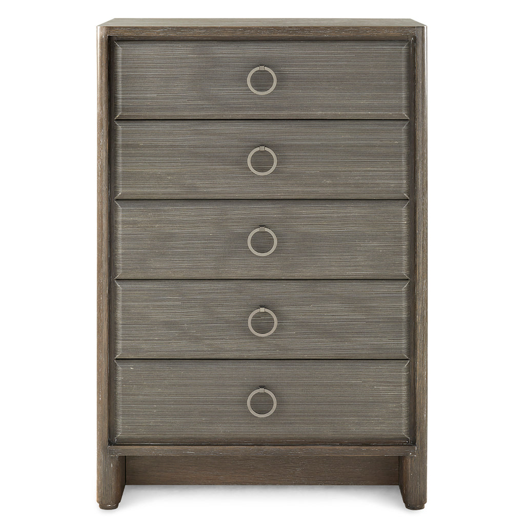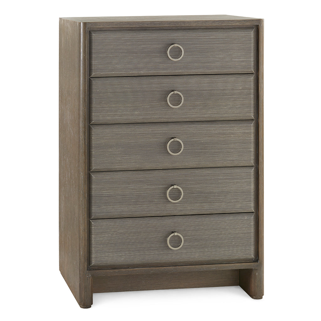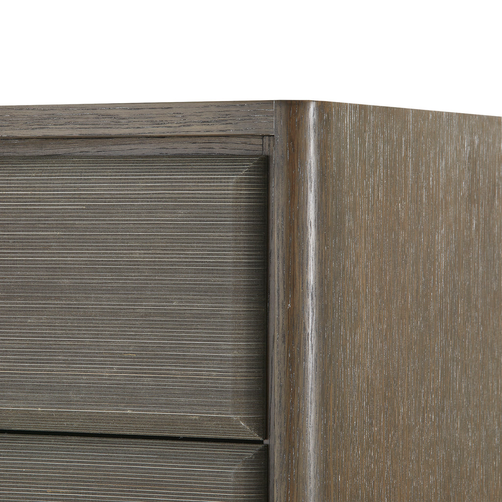 The V&H Wesley Collection embodies understated glamour, seamlessly blending refined materials with craftsmanship. Each piece is constructed from richly stained oak, providing a warm and strong foundation. The drawer fronts are meticulously wrapped in silky grasscloth, imparting a subtle sheen that enhances its elegant allure. Satin bronze drawer pulls serve as the perfect finishing touch, adding a hint of luster and complementing the overall design. This harmonious combination of textures and tones makes the Wesley Collection a timeless addition to any interior.
