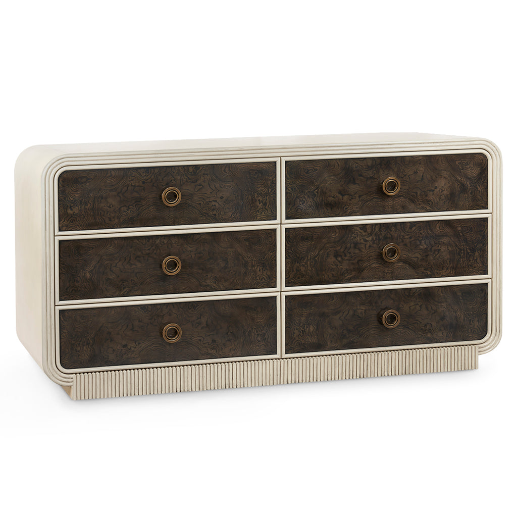 The V&H Wyatt Collection embodies bold modernity with its distinctive design elements. Each piece has been designed with gracefully curved corners and fluted edges and is finished in a luminous Sailcloth Sheen that accentuates its sleek contours. The rich burlwood-paneled drawer-fronts are adorned with a subtle, organic pattern that adds visual interest and elevates the design. Hand-cast antique brass ring pulls complete the design, adding a touch of subtle shine to this contemporary collection.