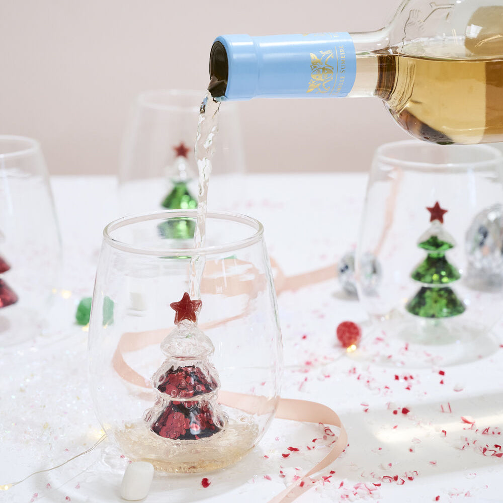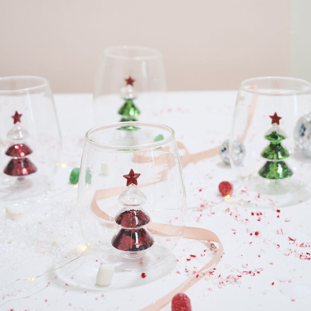 Cue the confetti with a celebratory drink in the Glitter Tree Drinkware, a delightfully festive stemless glass complete with a star-topped, red glitter filled tree inside. These clear borosilicate glasses have a wide rounded base, slightly tapered opening, and are perfect for sipping mulled wine or sparkling beverages. Surprise guests with drinks in these playful glasses or give a set as the perfect holiday hostess gift alongside a bottle of bubbles.