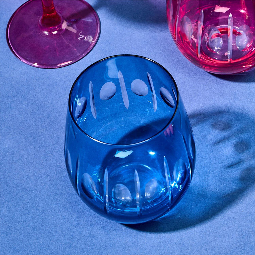 Sparkling Cut Blue Hand Engraved Stemless Wine Glass Set of 4