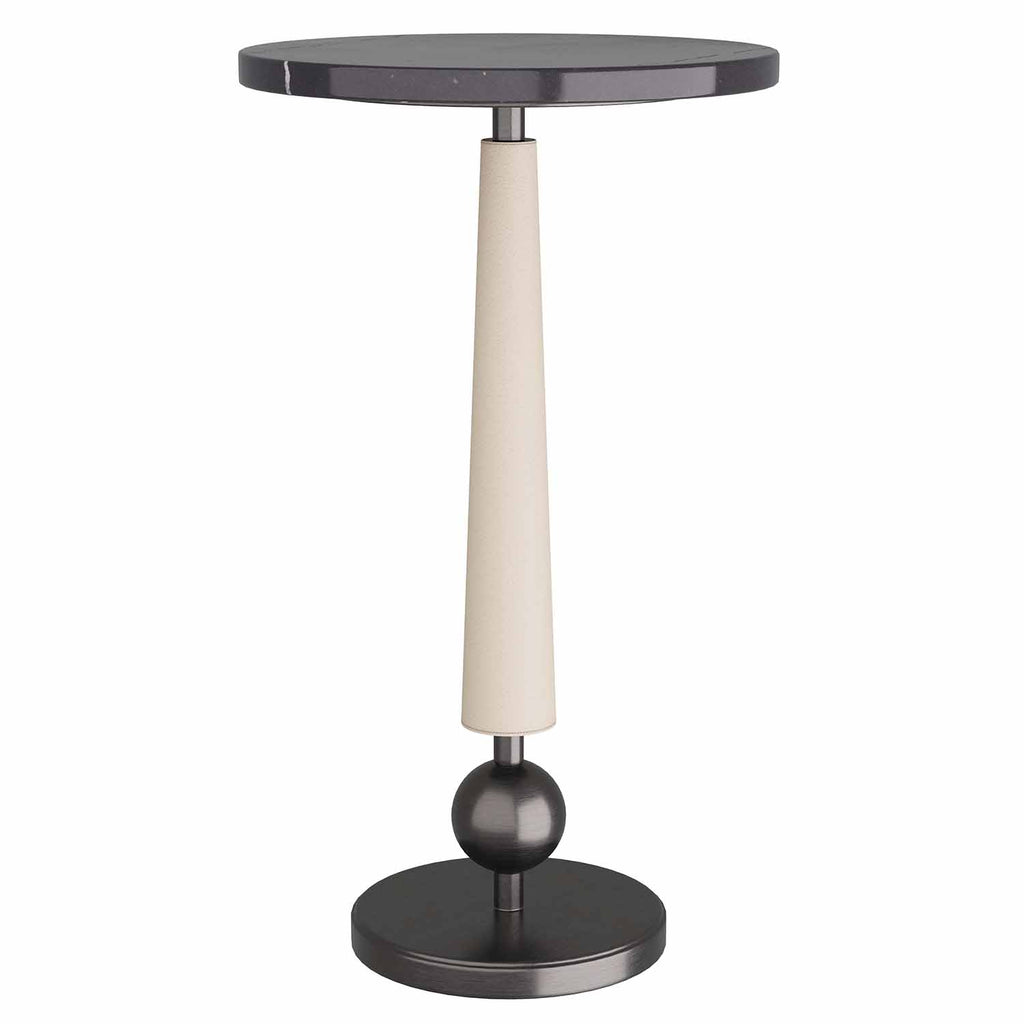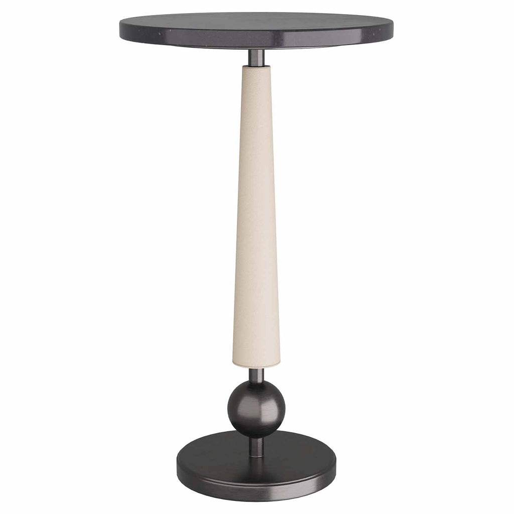 Diminutive yet dynamic, the Arteriors Valari drink table is lavished in a contrasting composition of materials. The mixed-media table is cleverly designed with a tapered ivory leather post that supports a black marble top. A bronze iron plate base with a graphic ball detail completes the imaginative table. Finish will vary.