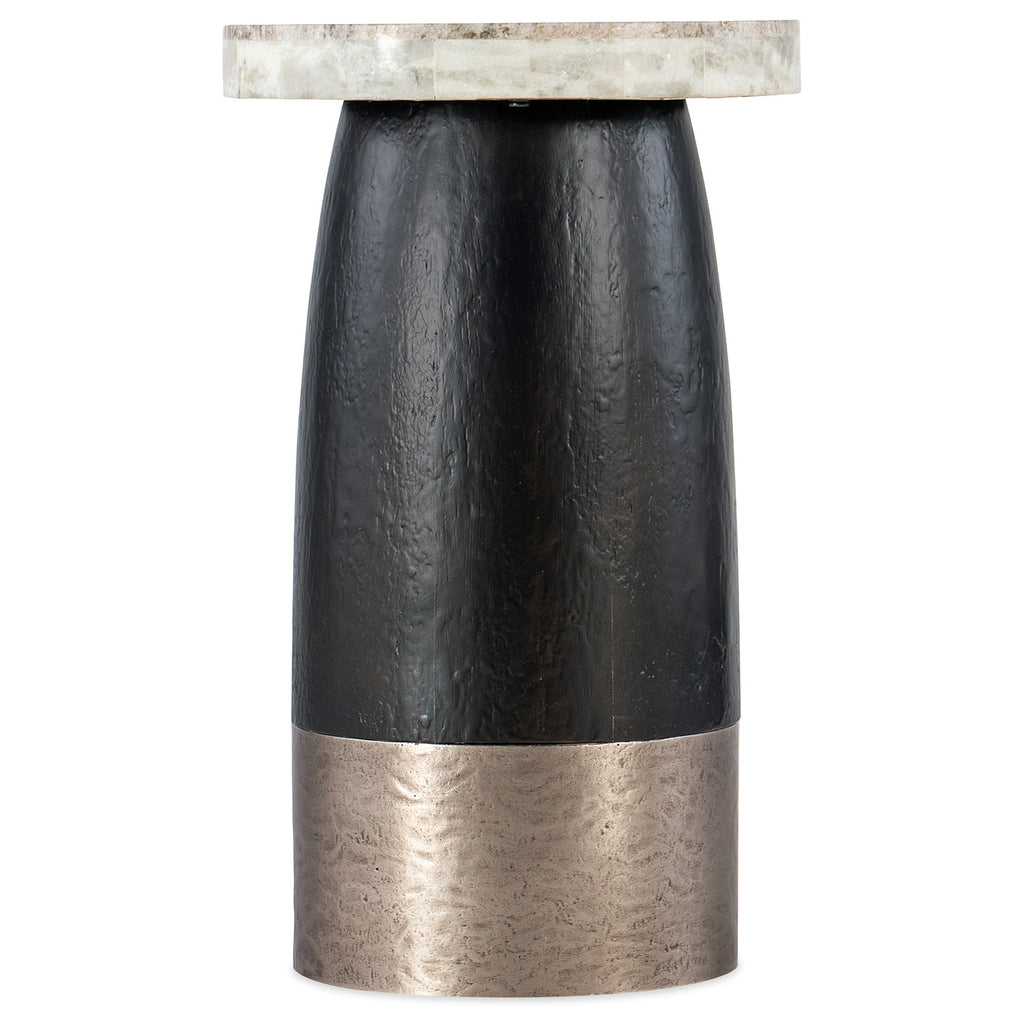 Inspired by downtown urban living, the Chapman Martini Table features an eclectic mix of materials: a black base with a hand-hammered forged pewter accent and a travertine stone veneer top with natural patterns and veining.