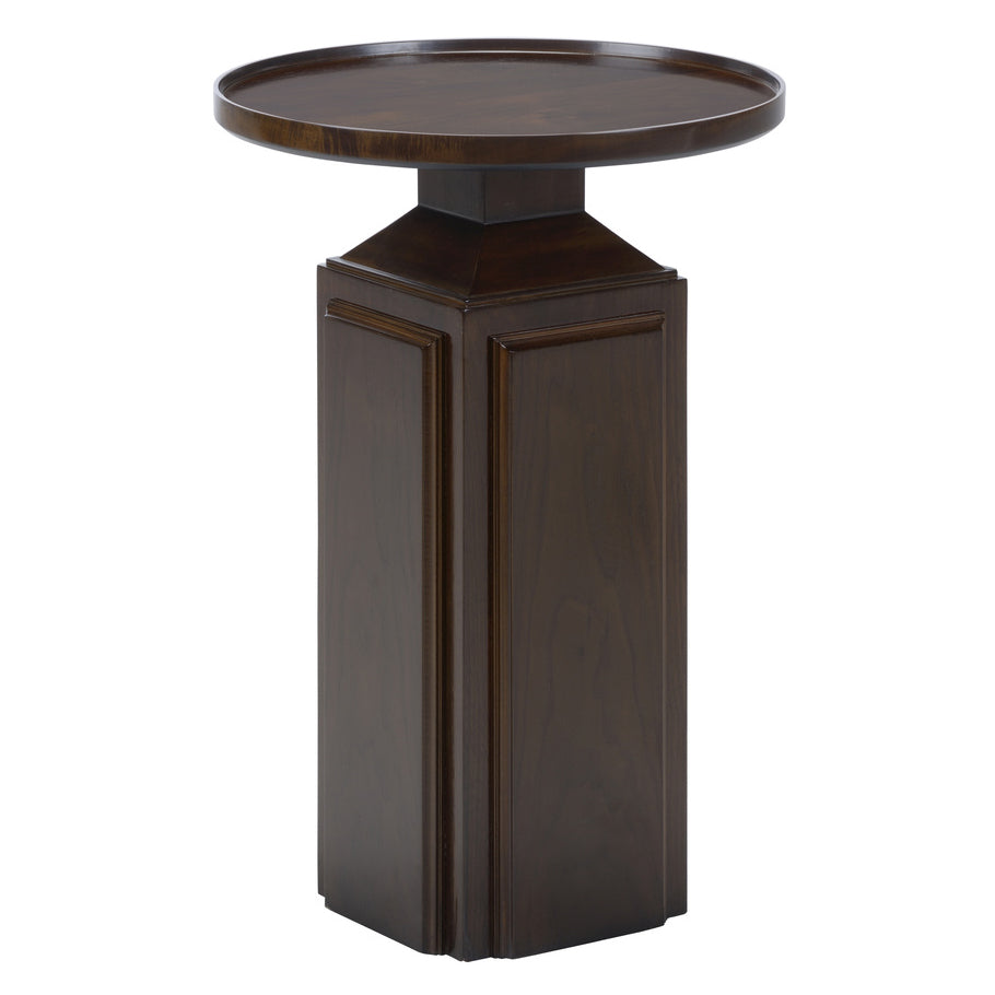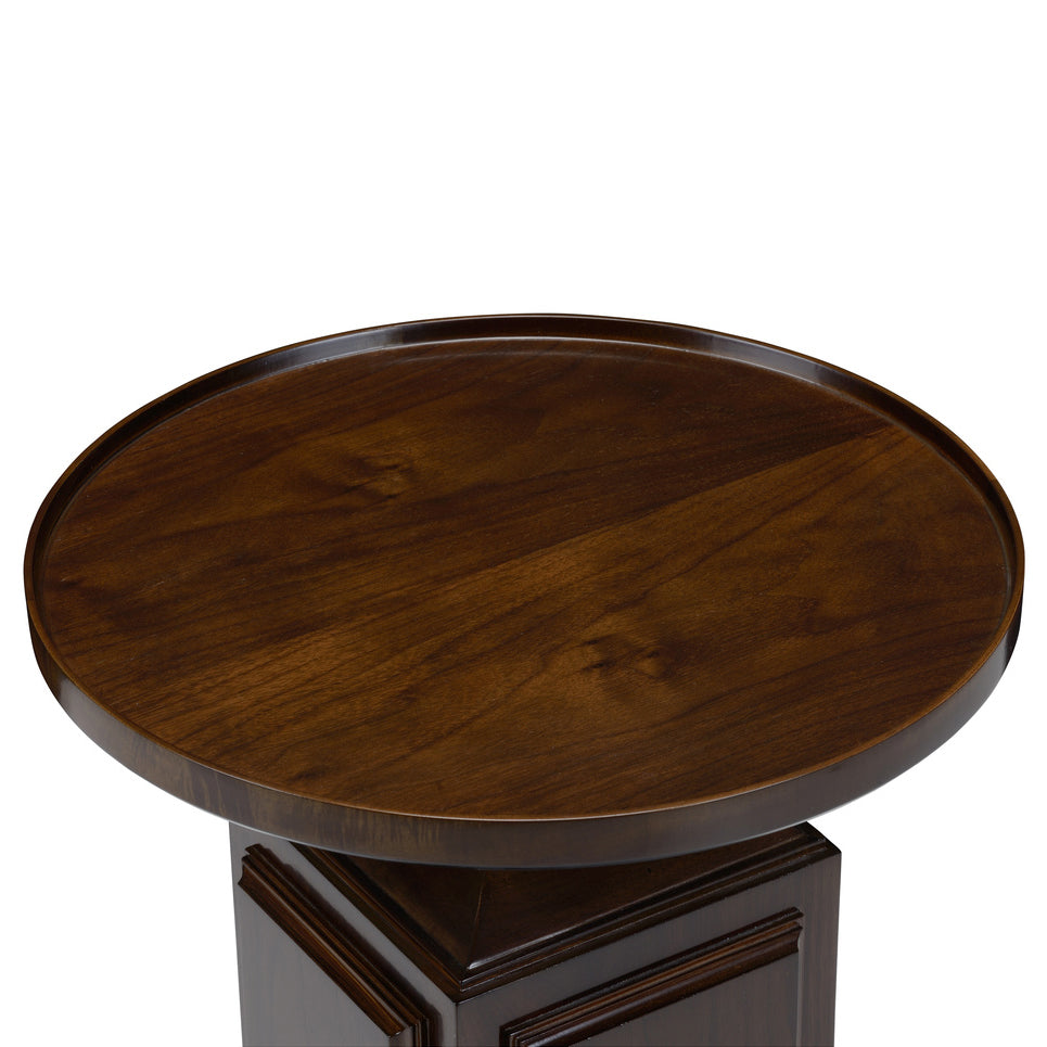 Create a space beside the sofa or your favorite chair for drinks and other personal items with our Spot On! Table. This contemporary table is crafted of acacia wood with a walnut veneer. It has a sturdy square base that supports a round top with raised edge. The dark brown finish enables it to blend with existing decors.