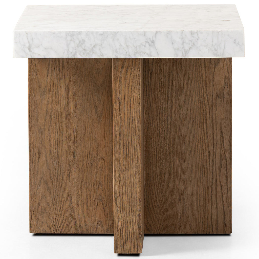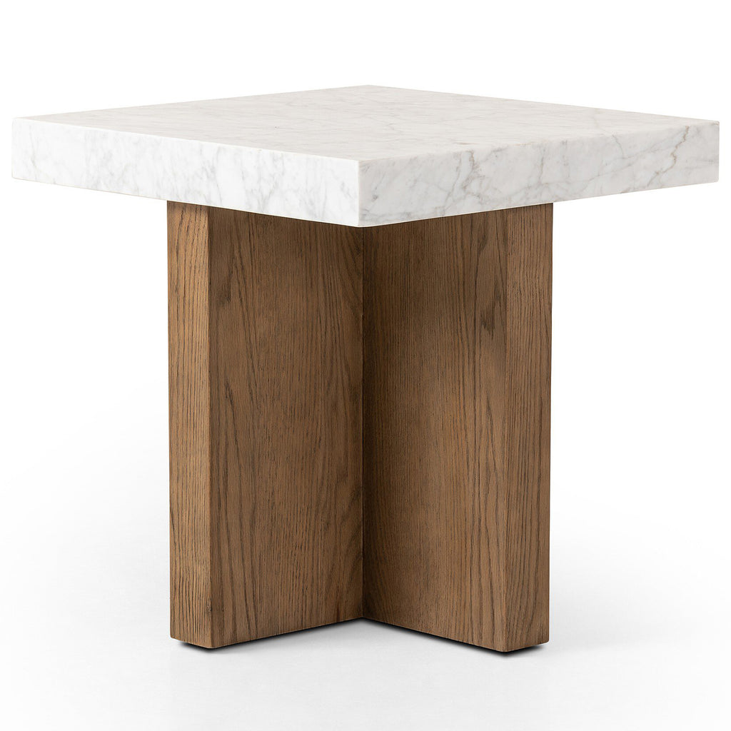 Structured lines and chunky proportions fuse for a mixed material end table of smoked oak and polished marble.