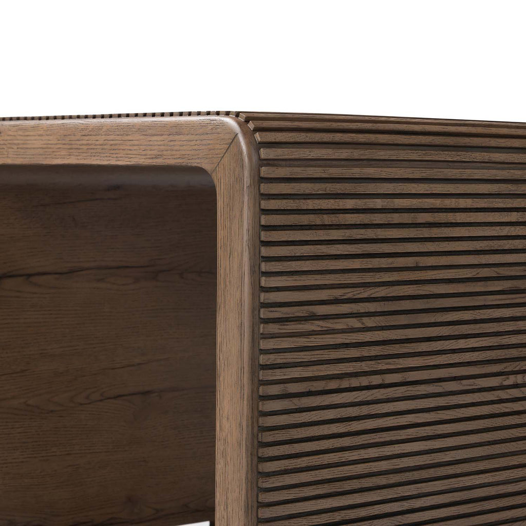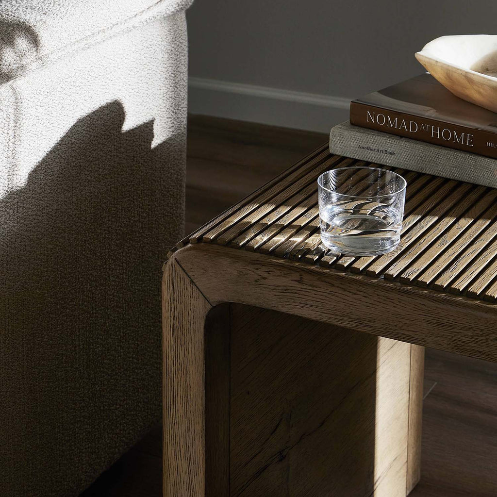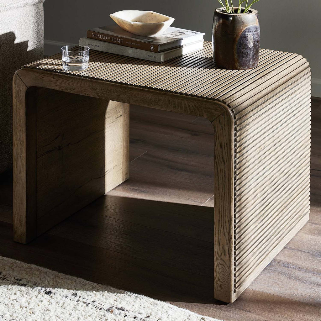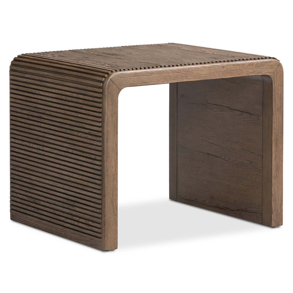 Made from rustic-finished oak, linear reeding and a curved shape define this midcentury-spirited end table. Designed in partnership with longtime Four Hands collaborator Thomas Bina and Brazilian designer Ronald Sasson.