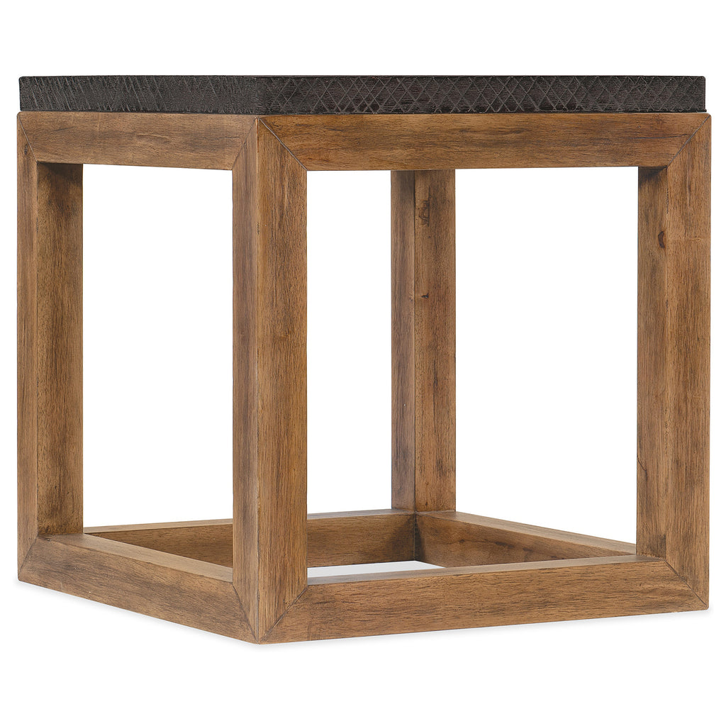 With a simple and straightforward square-shaped silhouette that evokes the weight, heft and heritage of beam construction, the Big Sky End Table boldly contrasts a Vintage Natural wood base with a crosshatch texture on the top in the charcoal Furrowed Bark finish.