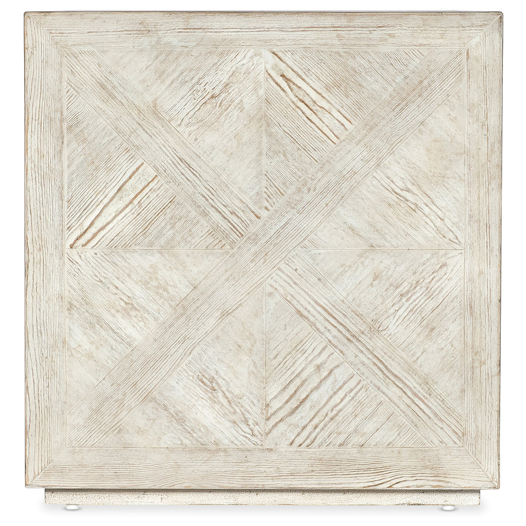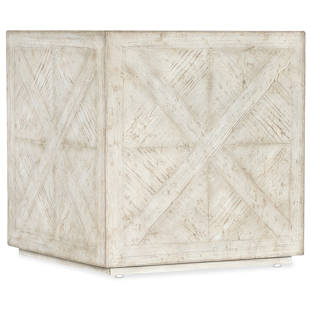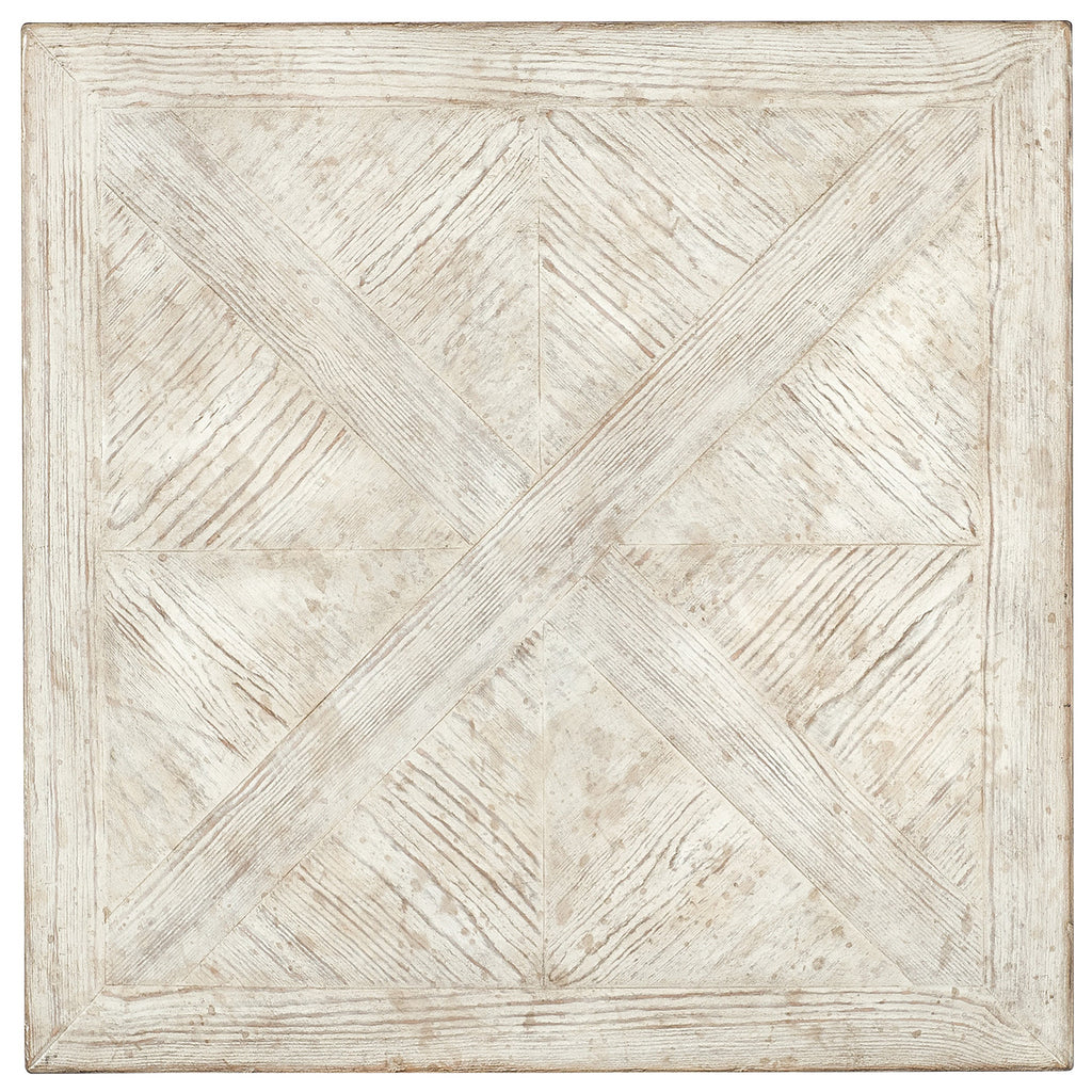 In a cube-like form, the 24-inch square Block Buster End Table is crafted of Pine with parquet-patterned veneers in a creamy white finish with rub-through and distressing and a plinth base.