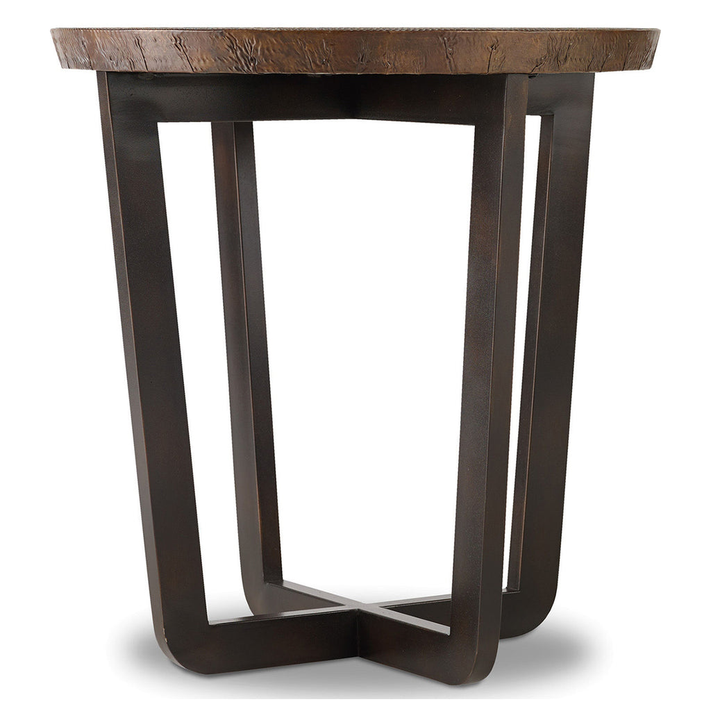 Rustic modern goes bold with the Parkcrest Round End Table, combining an aged copper top with a forged metal base in a dark finish for an earthy and casual appeal.