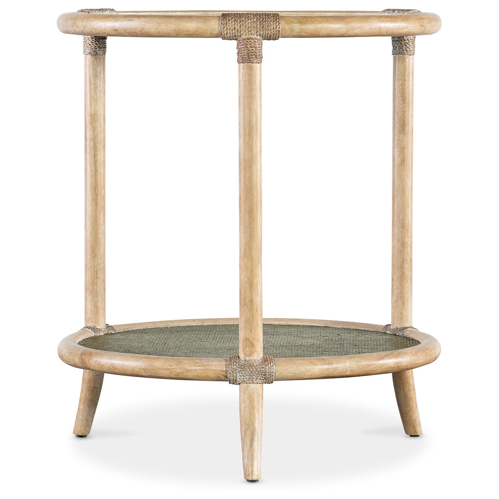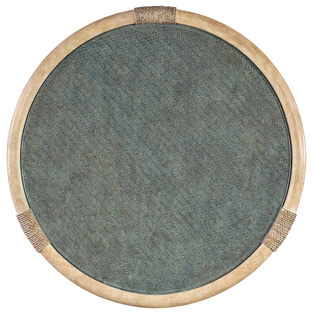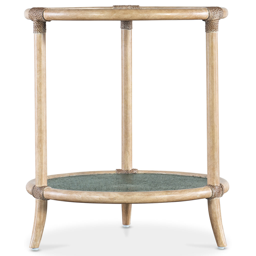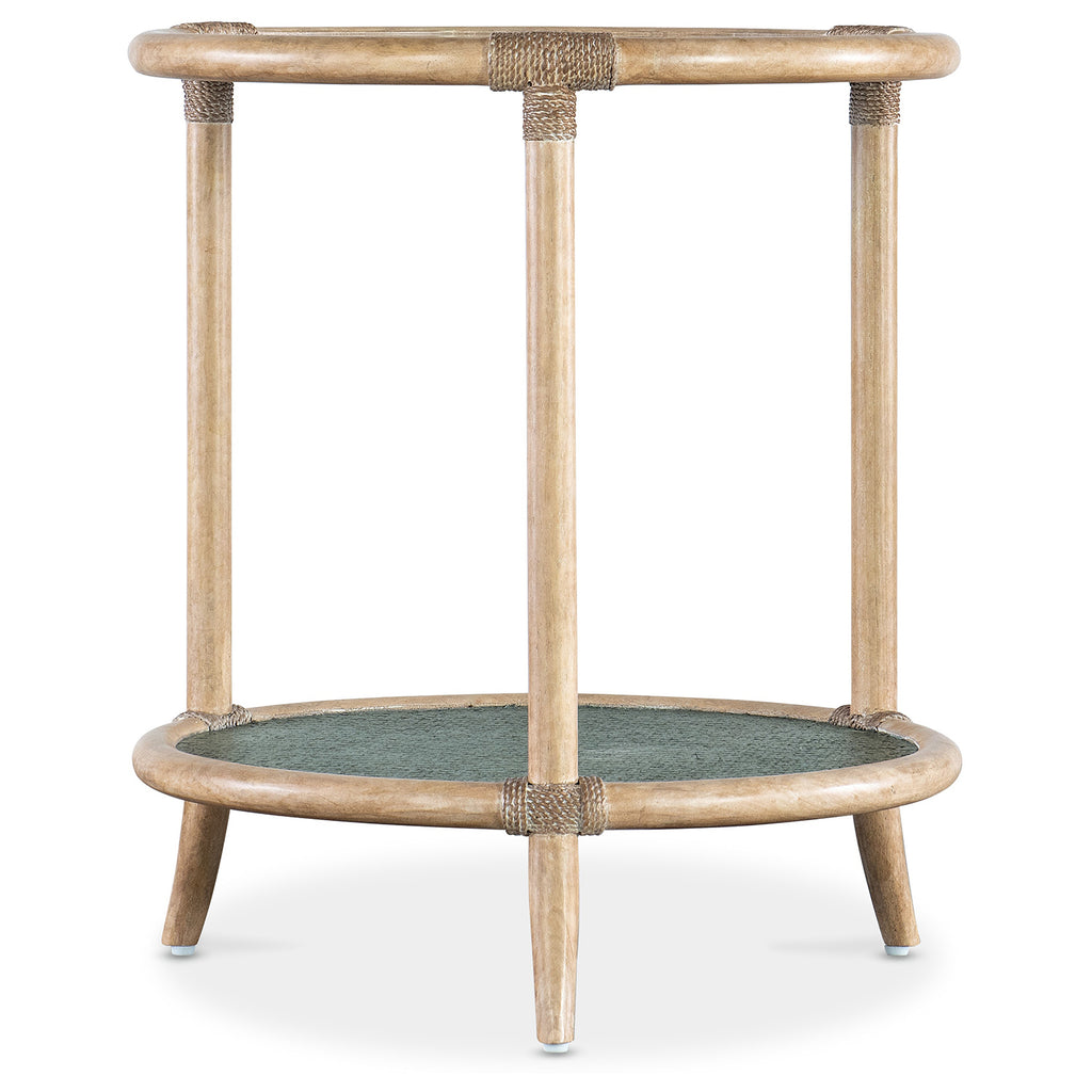 Inspired by tropical getaways, the Retreat Raffia End Table is a mixture of organic materials in a laid-back and versatile design. The table combines Maple Veneers, Raffia, Rope and Tempered Glass, with a Painted Raffia top and bottom shelf in a Green finish, a glass-top insert and Rope accents. The frame and legs of the table are finished in the sand-colored Dune, transparent by design to reveal the unique grain patterns of the wood veneer.