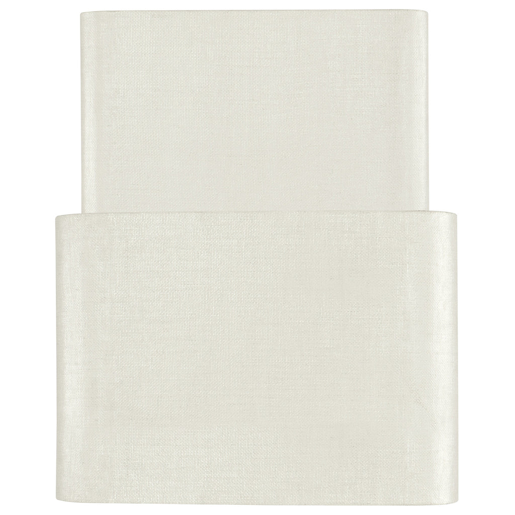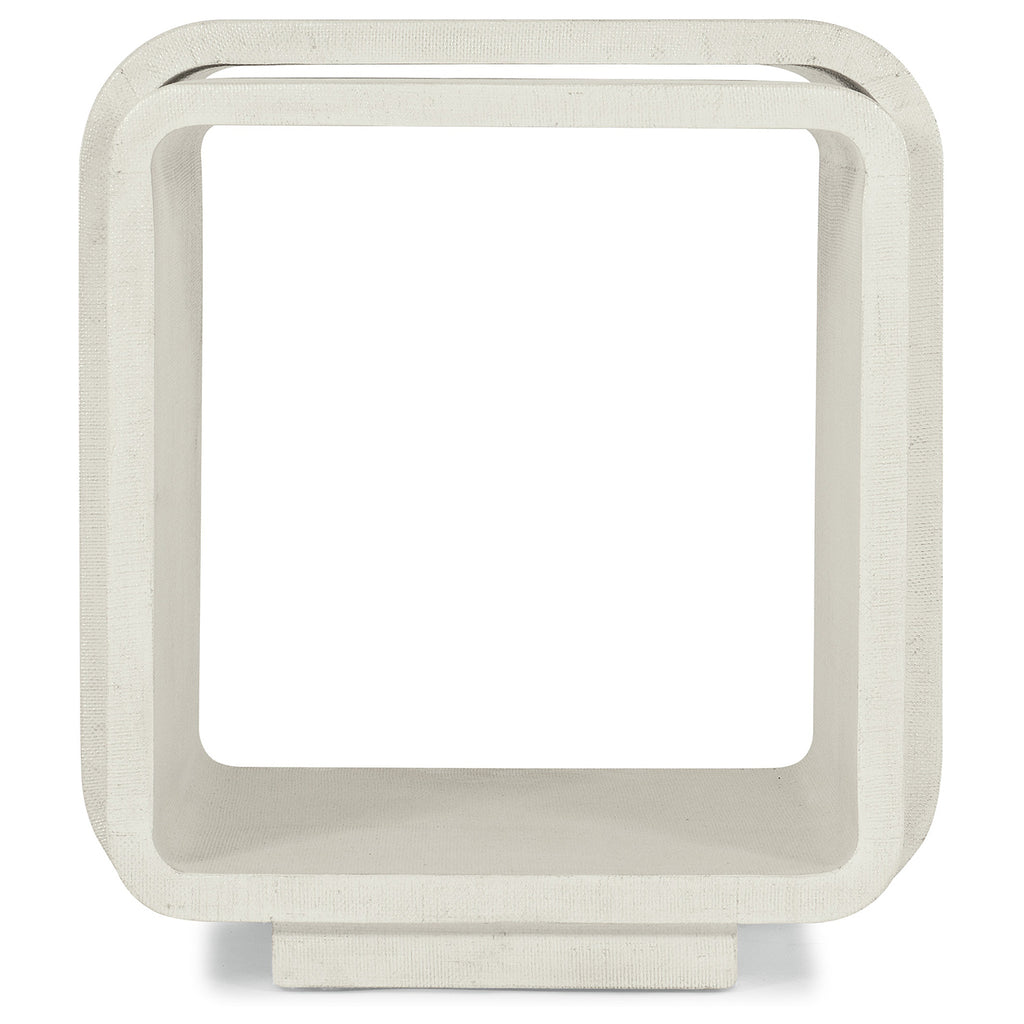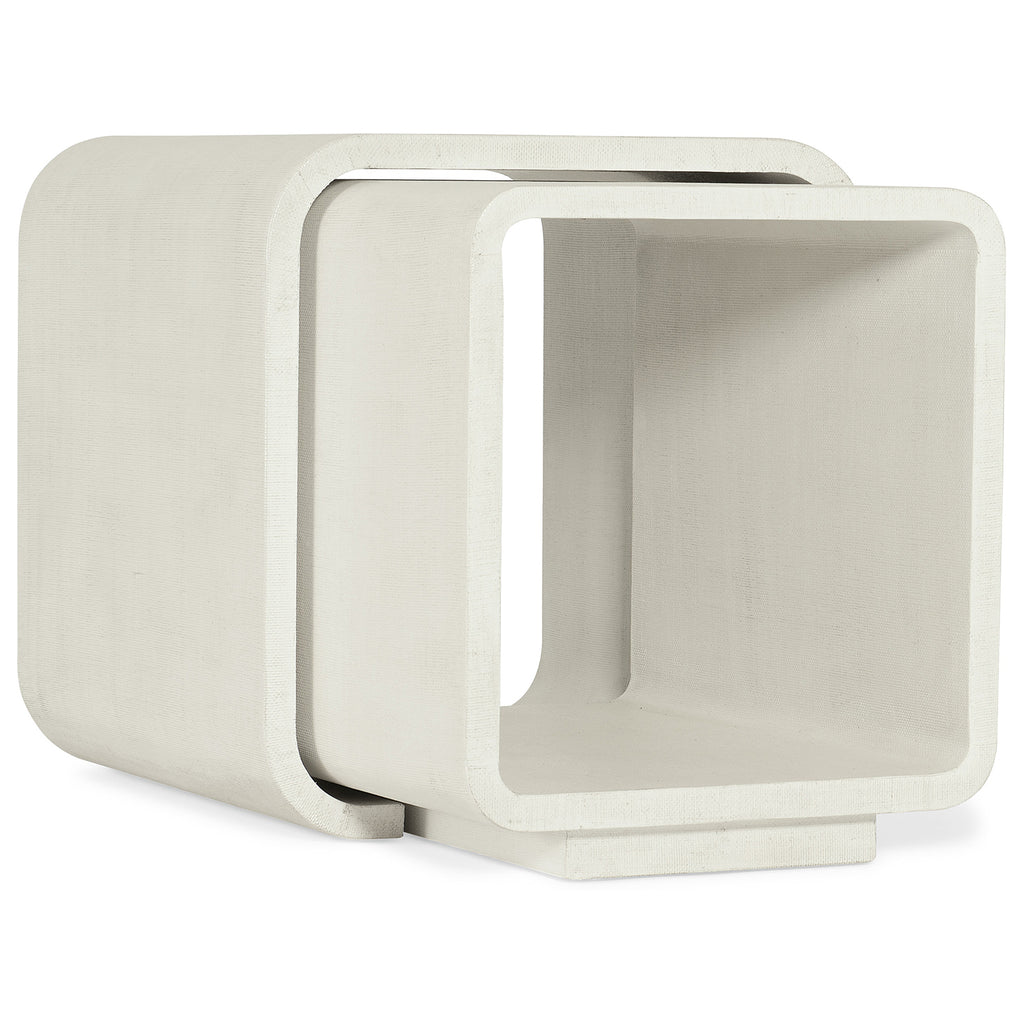 Soft, modern and organic, the Kai Bunching Tables in a rounded rectangle shape are crafted of Wood and Raffia in the soothing Sand Dollar finish, a white lacquered grasscloth. The smaller table fits inside the larger table and can be used separately from the larger table.