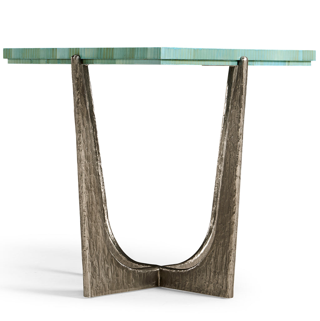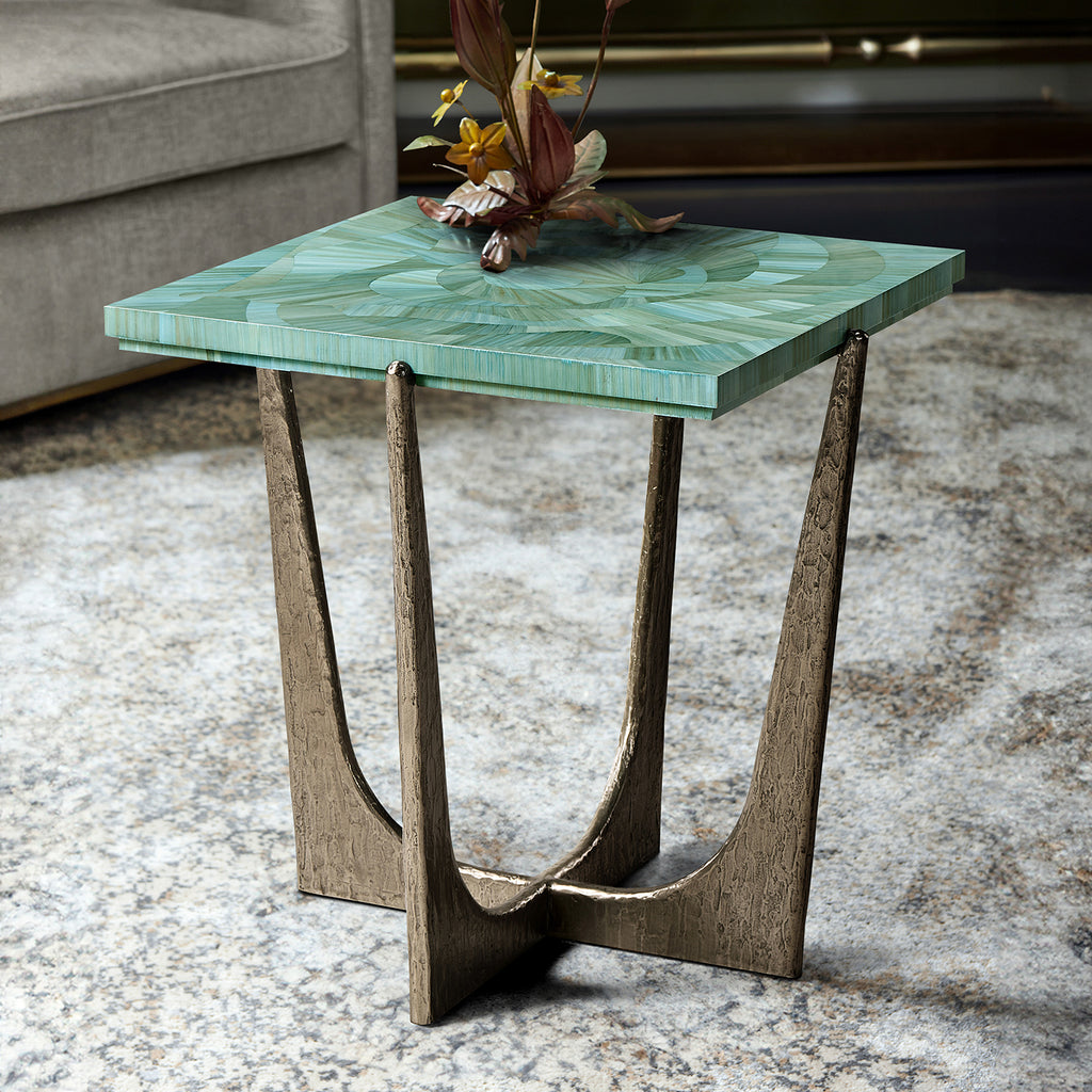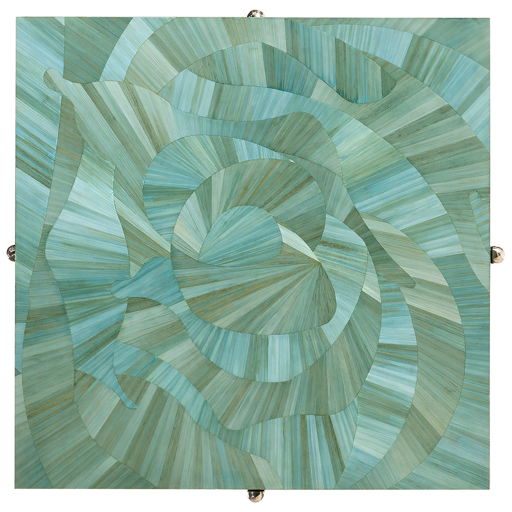 Introducing the Sea Glass End Table, a captivating accent piece that embodies coastal elegance and artisanal craftsmanship. With a square 14-inch top, this table is adorned with intricate hand applied straw marquetry, reminiscent of the gentle undulations of ocean waves. Dyed in tonal blue hues, the straw art is protected with a lacquered finish. The curved base is made from wax-cast stainless steel with added texture to compliment the impeccable artisan work on the table top.
