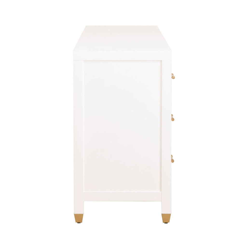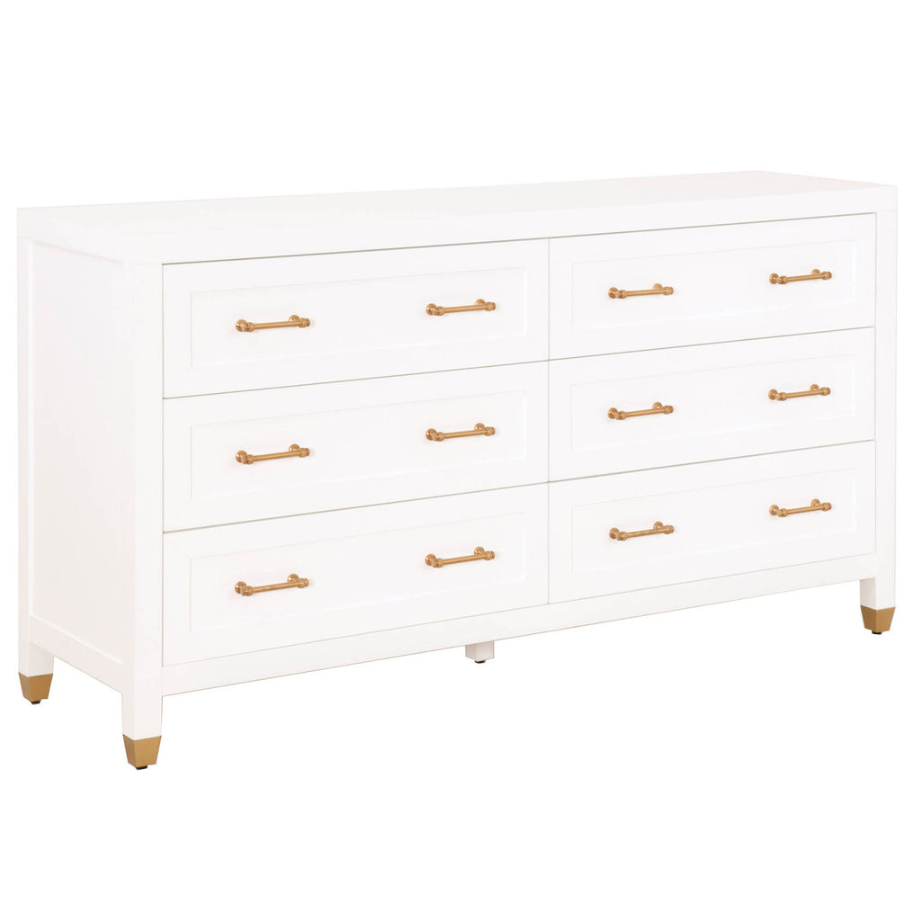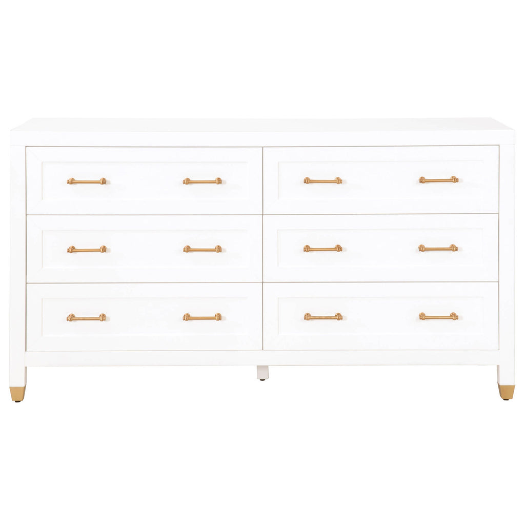 A sophisticated double dresser with a modern flare, the Essentials for Living Stella double dresser is constructed with 6 large storage drawers, this matte white dresser has plenty of space to store clothing and display pictures, perfume bottles or a television on top. It is accented with brushed brass pull handles and hardware, giving this nightstand a transitional look that will be a great addition to your bedroom.