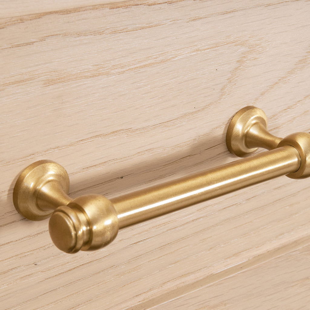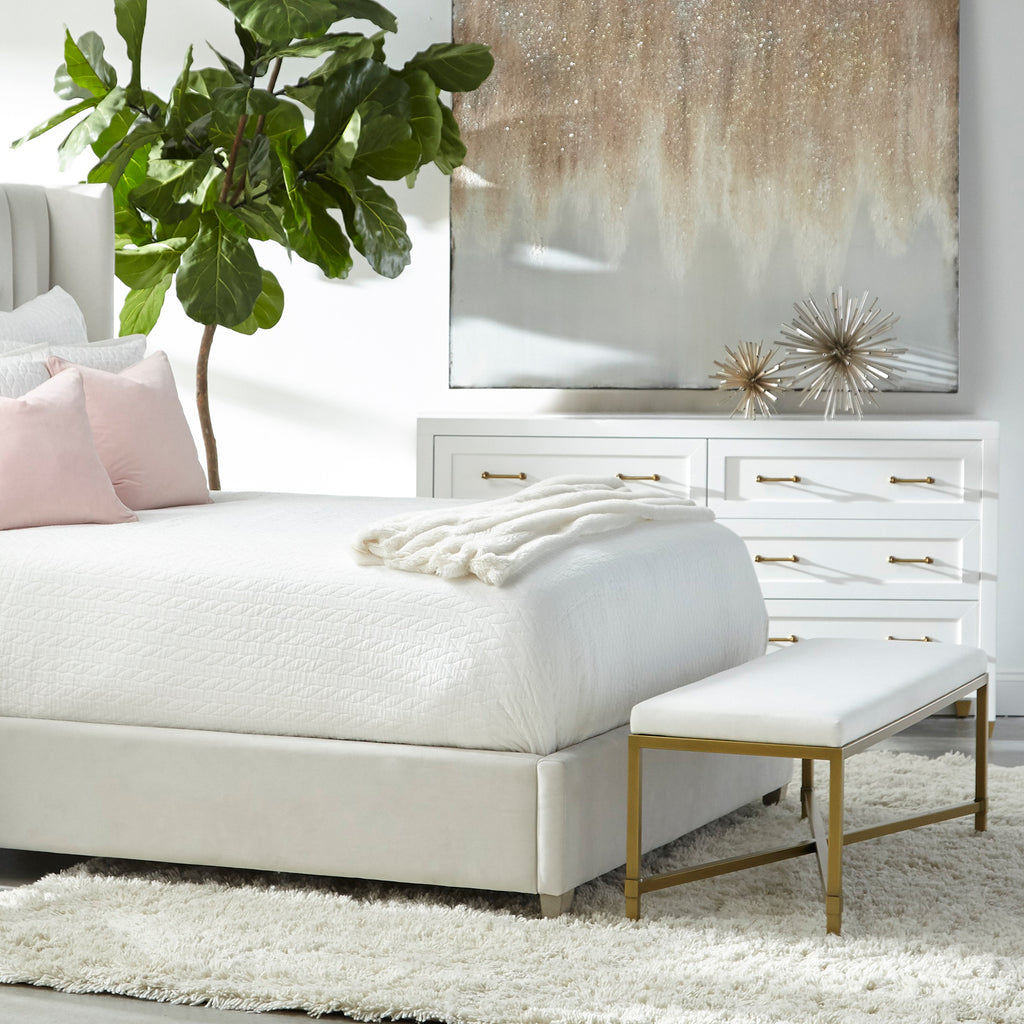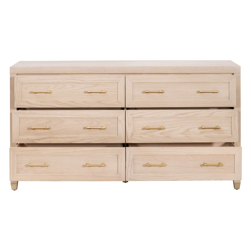 A sophisticated double dresser with a modern flare, the Essentials for Living Stella double dresser is constructed with 6 large storage drawers, this matte white dresser has plenty of space to store clothing and display pictures, perfume bottles or a television on top. It is accented with brushed brass pull handles and hardware, giving this nightstand a transitional look that will be a great addition to your bedroom.