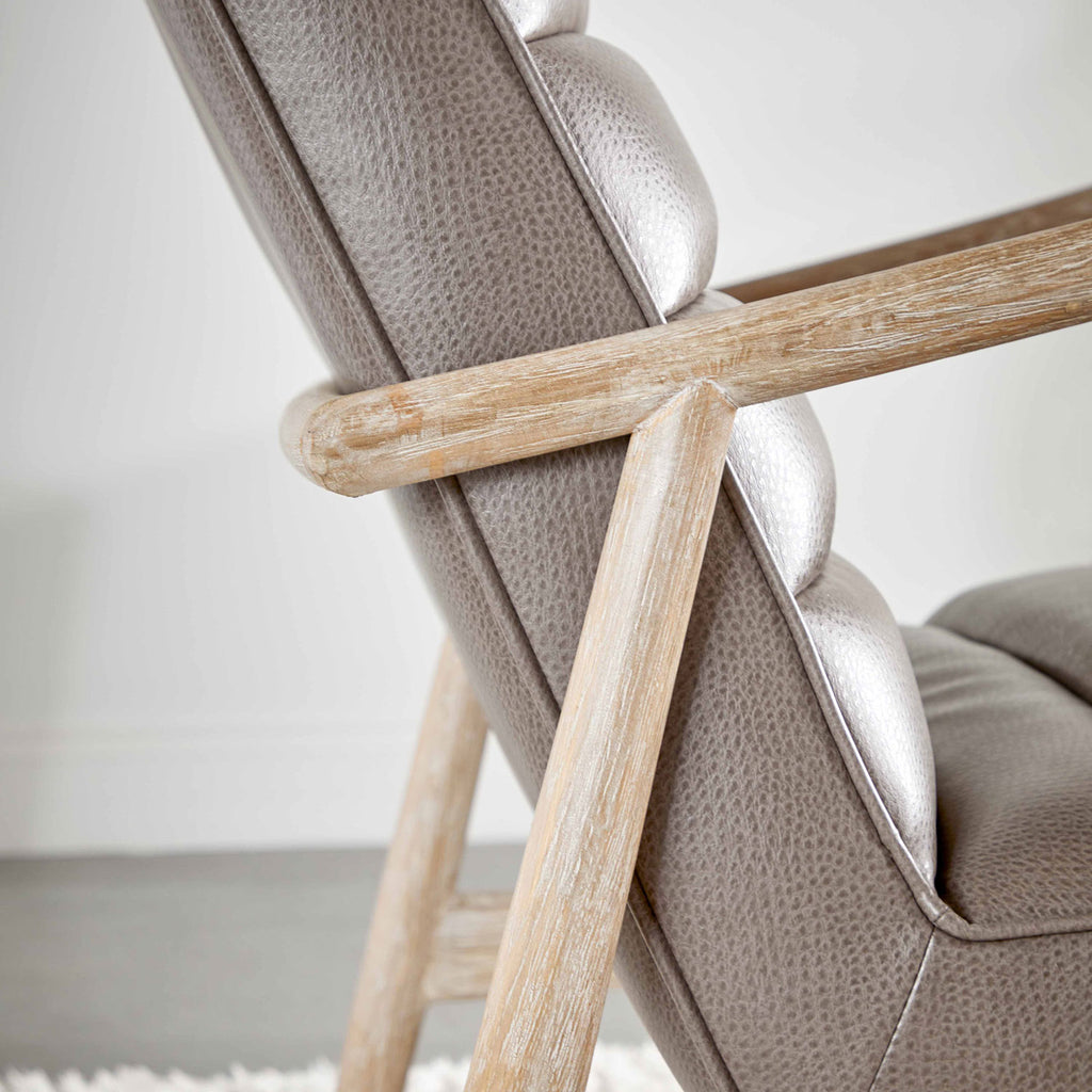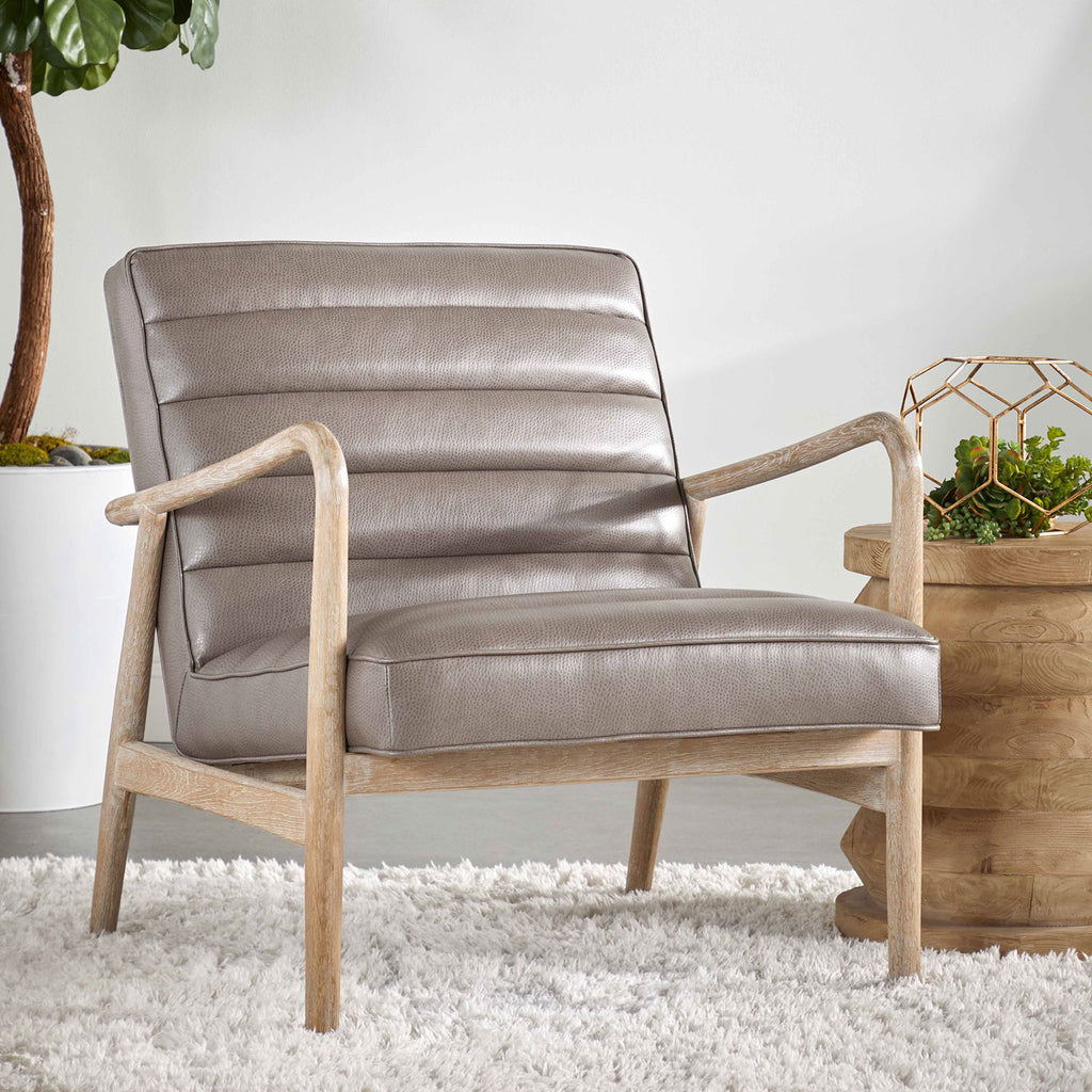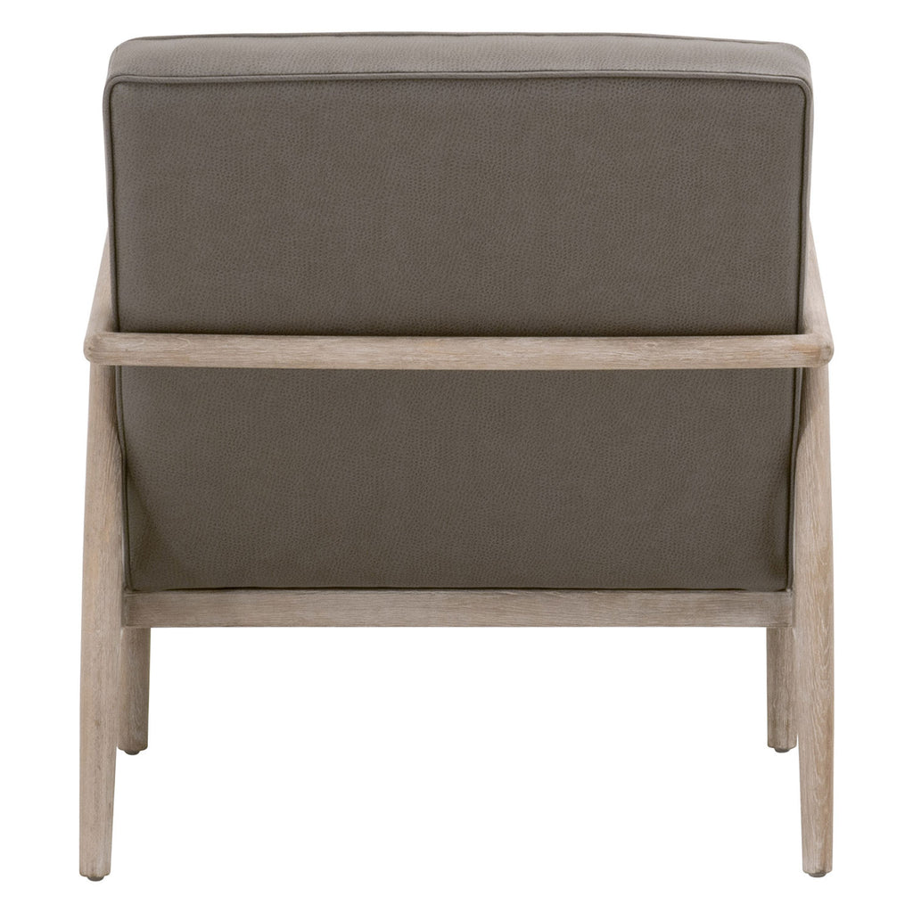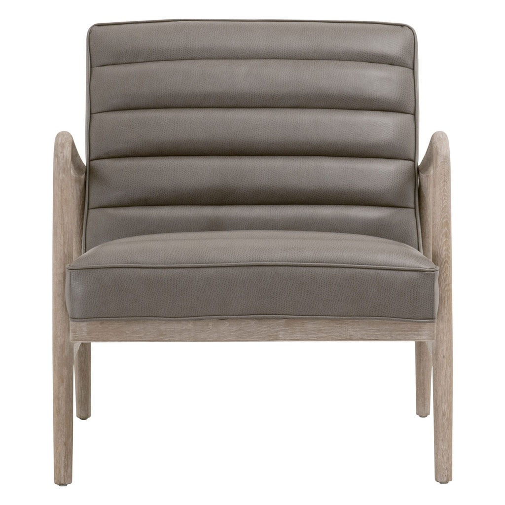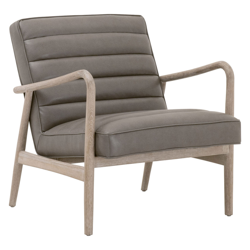 Contemporary framework blends with transitional style to create the unique Essentials for Living Tahoe club chair. Ideal for additional and accent seating, this sleek club chair will be a great fit with many interior designs. It's constructed with a beautiful solid oak in natural gray tones. This pairs perfectly with the gray synthetic leather seat. The seat has a horizontal channel design and pipe edge detailing. Add this accent chair to a living room, bedroom or reading nook for a dynamic setting. Stitch & Hand Collection's Synthetic Leather is not genuine leather, it is a man-made product and should be cleaned with oil-based products.