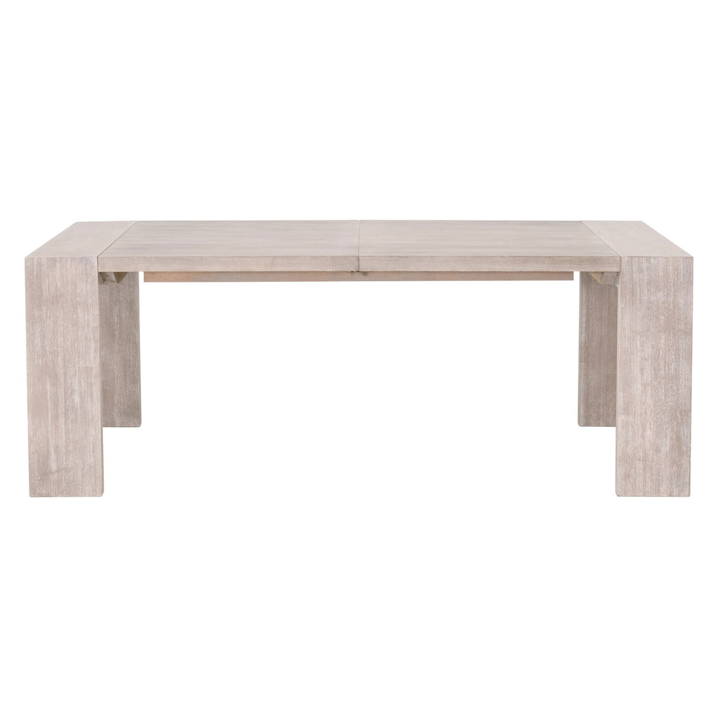 Simplicity meets modern and traditional designs with the Essentials for Living Tropea  extension dining table. Constructed with a sleek and simple silhouette, this wood table was thoughtfully crafted to create plenty of space to enjoy dining with your loved ones. The wide, squared table legs are molded to the tabletop to create a seamless look. This creates plenty of space for chairs to slide under the table on each side without worrying about bumping into a base. It is made of natural gray acacia wood and contains two removable leaves. Comfortably seats up to 8 people with both leaves inserted. Tradition Collection's Acacia Veneer finish is sandblasted to create a rustic appearance. This process accentuates the natural grain of the wood and creates a variation in both color and texture. The existence of natural knots, cracks, scratches, and marks in the surface of the wood should be expected.