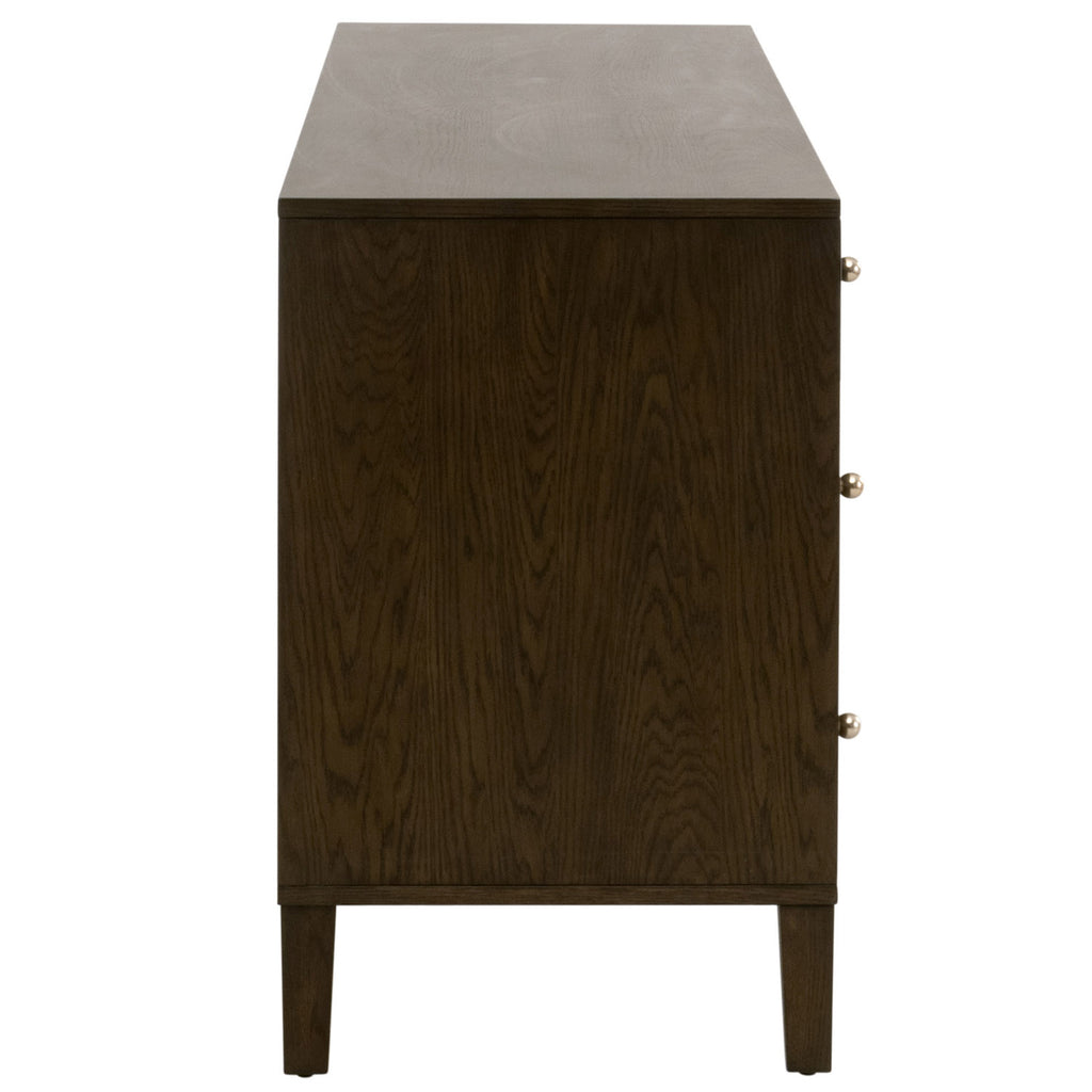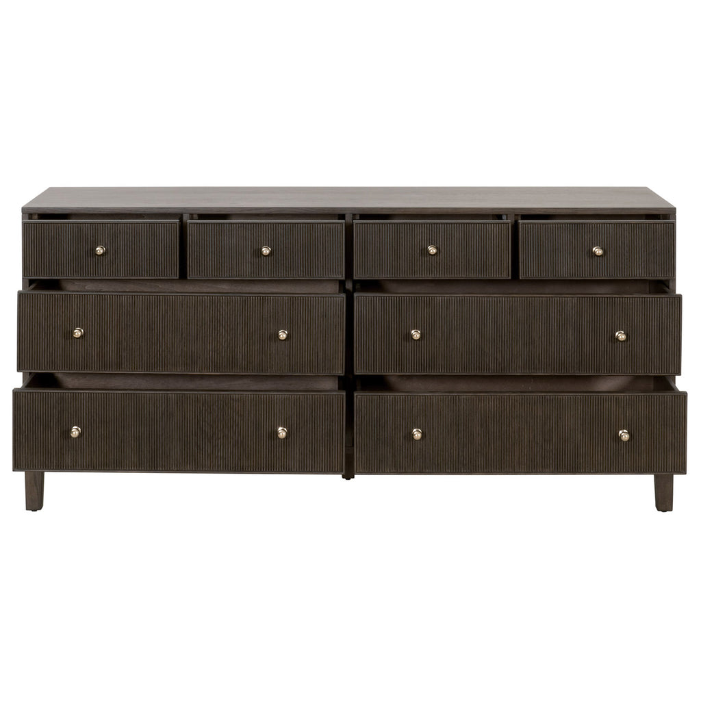 The Highland 8-Drawer Double Dresser by Essentials For Living combines unique style and functionality. This extraordinary piece is crafted from solid oak wood and oak veneer with a Dutch brown oak finish. This darker wood finish has beautiful wood grain on the outer casing, while the fluted wood drawer fronts add character and dimension. The drawer knobs are made of solid iron with a polished brass finish, adding both simplicity and elegance. Measuring 67.5in wide, 20in deep, and 32in high, this dresser provides ample storage with eight drawers, including felt-lined top drawers for your delicate items. The dual metal drawer glides ensure easy operation as well. Redefine your bedroom or guest room with this eye-catching dresser built to flatter many interior styles.