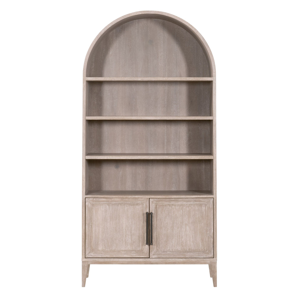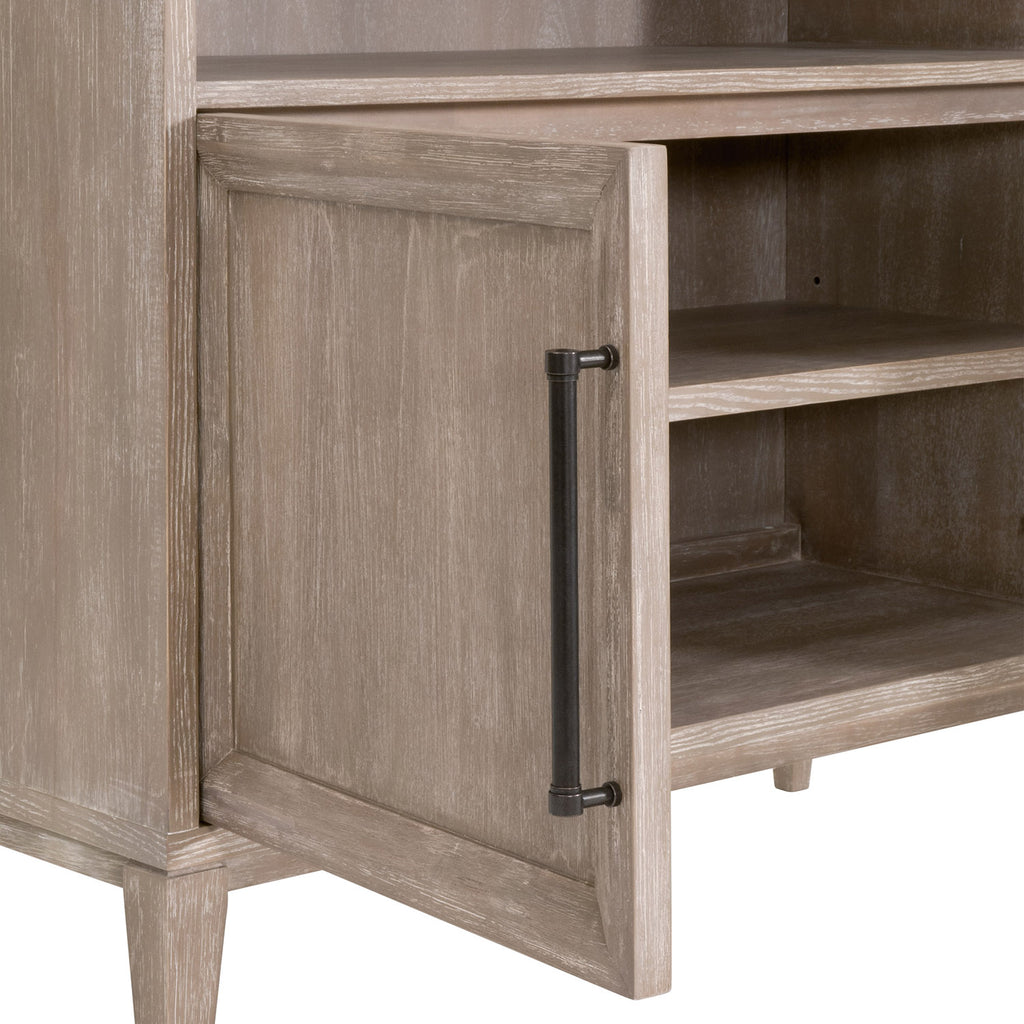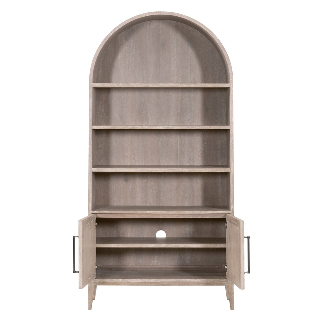 This tall Morris Storage Bookcase by Essentials For Living brings a refined, transitional look to any space with its natural gray acacia finish and clean, architectural lines. Crafted from solid acacia wood and acacia veneer, it features a versatile combination of open and closed storage, including a top fixed shelf, two open shelves with five adjustable positions, and a lower cabinet with an interior shelf offering three adjustable levels. A discreet cord management hole keeps electronics within the cabinet tidy, while the KD leg construction ensures sturdy support and easy assembly in a variety of interiors. It measures 42in wide, 17.75in deep, and 86.5in high.
