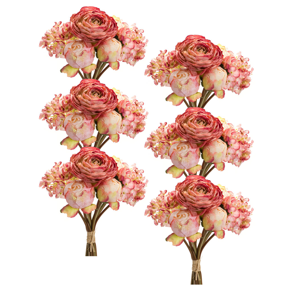 Coral Pink Peony and Hydrangea Flower Bouquet Set of 6