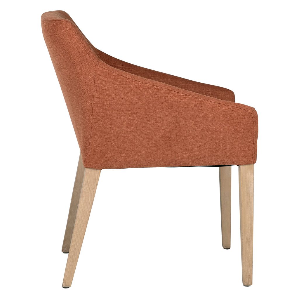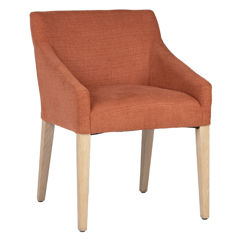 Featuring gently sloped armrests and a smooth, poly blend upholstery, this chair offers generous proportions and a roomy seat that makes it a comfortable choice for table seating or as an accent chair. The tapered wood legs in a natural brushed finish create the perfect look that fits any transitional décor. An extra cushy seat offers minimalist elegance and plush comfort wherever you use it.