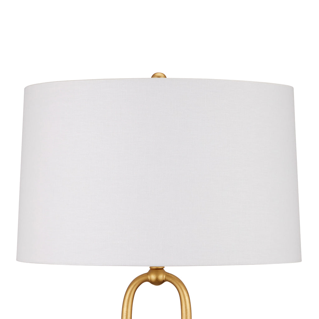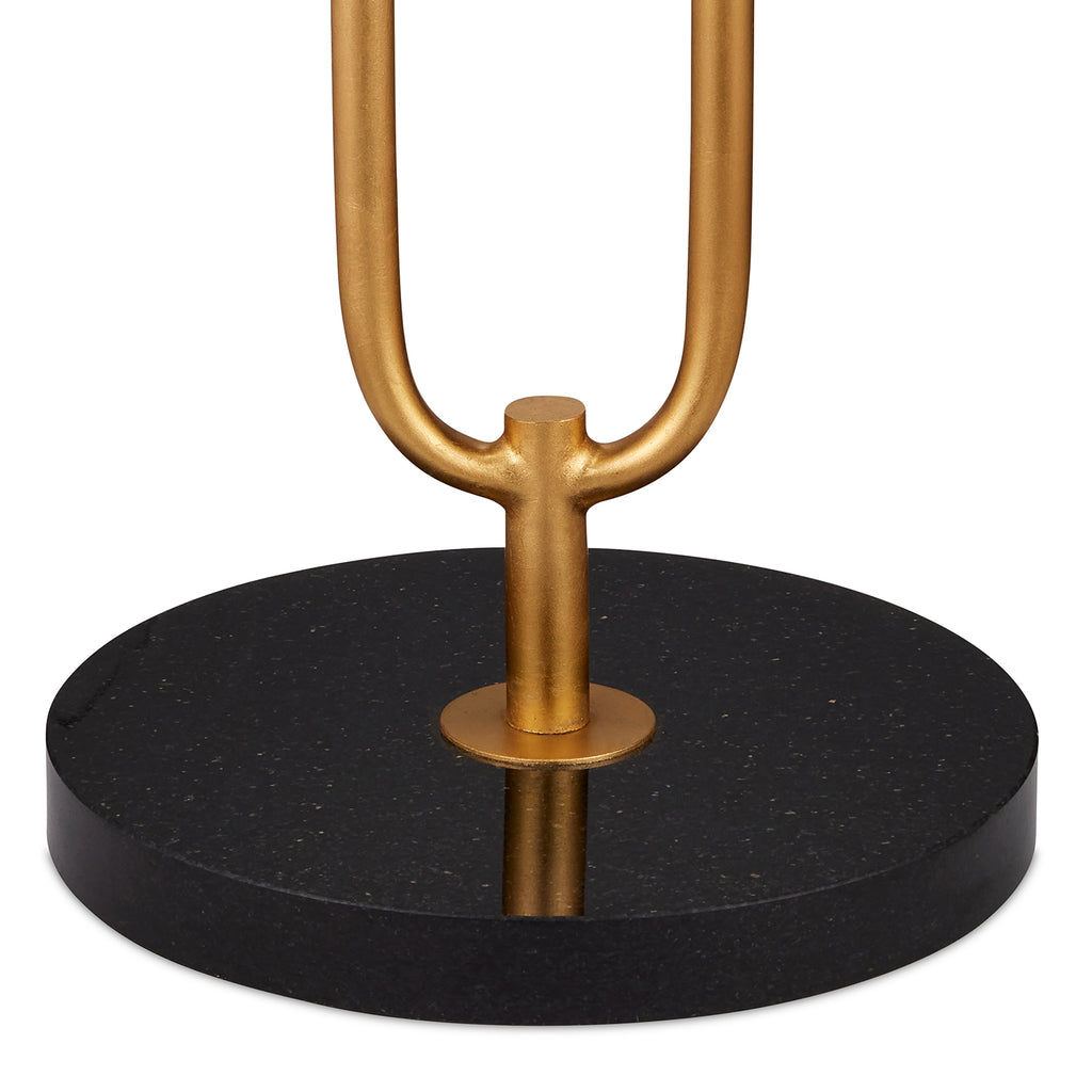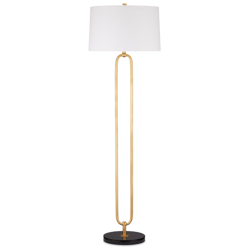 The oblong open-form body of the Currey & Co Glossary Floor Lamp is made of metal in a contemporary gold leaf finish. Clarence Mallari designed the gold floor lamp to look like a giant paper clip that rises above a black marble base. This contemporary design will be a perfect choice for a space needing stylish yet unobtrusive elements. The Glossary is topped with an off-white linen shade.