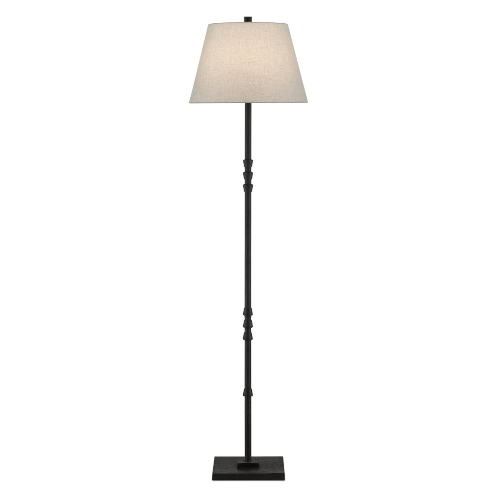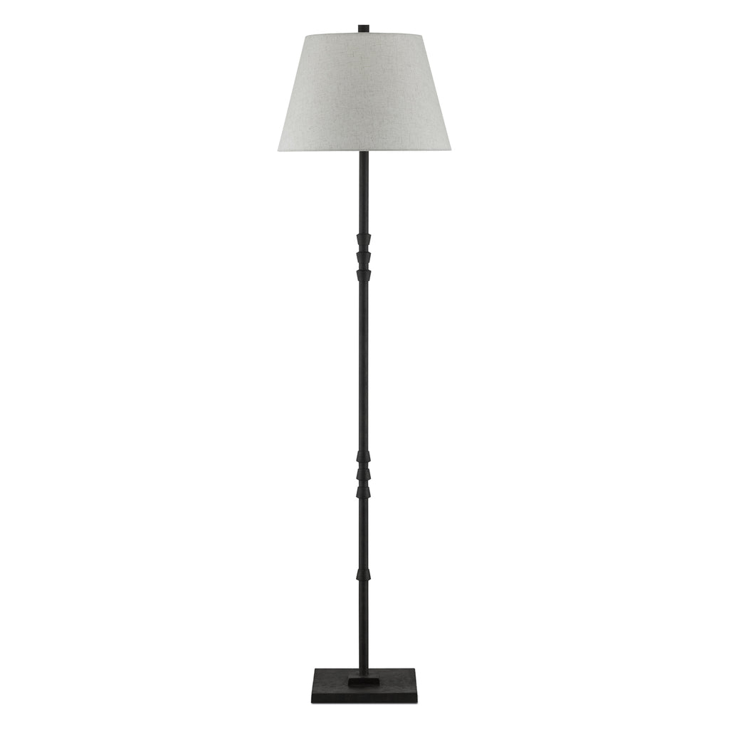 The mark of a talented designer is shown in the makeup of the Currey & Co Lohn Floor Lamp. The ornamentations on the thin stem have a balance to them that pleases the eye three upturned fluted motifs pointing toward the shade and one pointing toward the simple stacked base. Topping the cast-iron piece off, above the beige poplin shade, is a finial that has the same tonal qualities as the body of the lamp, which reads as black but has the subtlest of hints of dark brown texture to it.